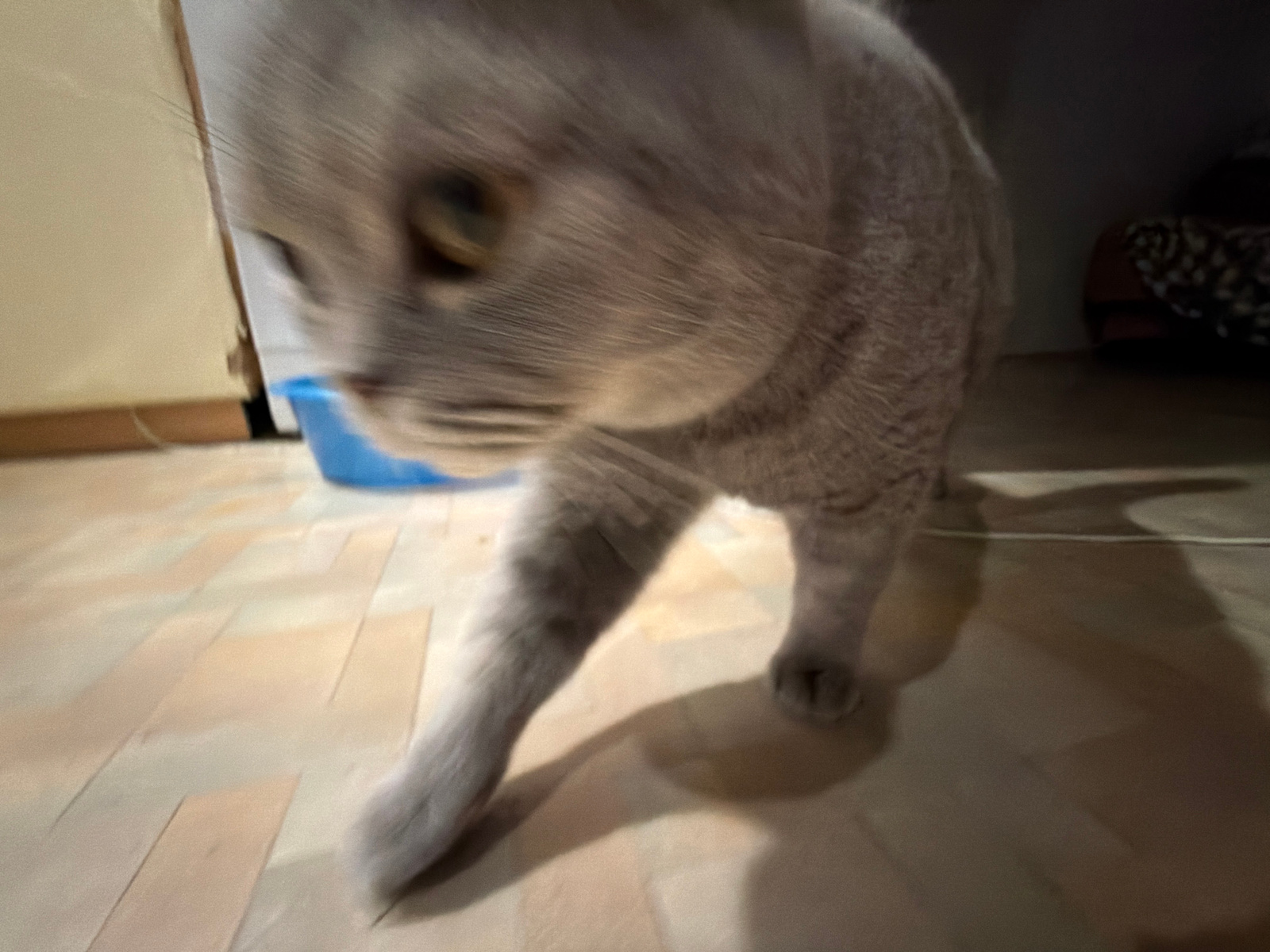 A blurry close-up shot shows a grey cat in motion on a floor with light-colored, rectangular tiles. A blue container is visible in the background near what appears to be a wooden cabinet. A shadow str…read more