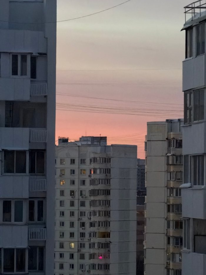 This image displays a residential cityscape in Khimki, Russia, at either dawn or dusk. The scene is framed by two multi-story, light-grey concrete panel residential buildings, one on the left and one…read more