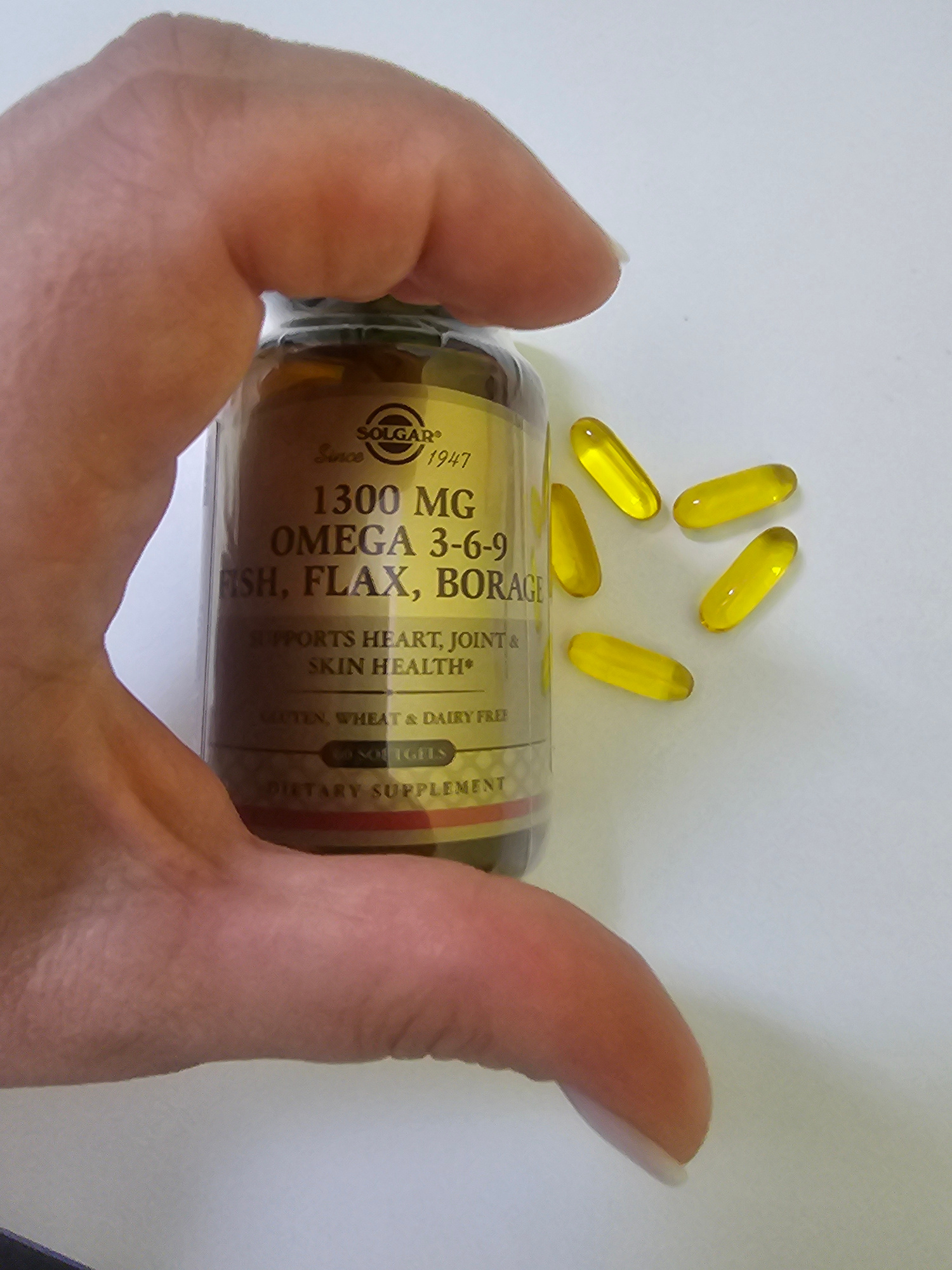 The image shows a hand holding a bottle of Solgar Omega 3-6-9 dietary supplement capsules. The bottle is amber-colored, and the label indicates it contains 1300mg of omega fatty acids derived from fis…read more
