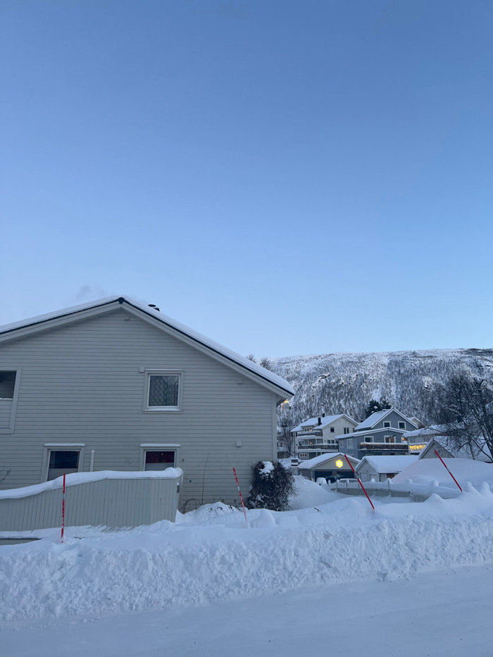 The image displays a snow-covered residential area within Tromsø, Norway, under a clear, pale blue sky. A significant snowdrift dominates the foreground, partially obscuring a white picket fence and t…read more