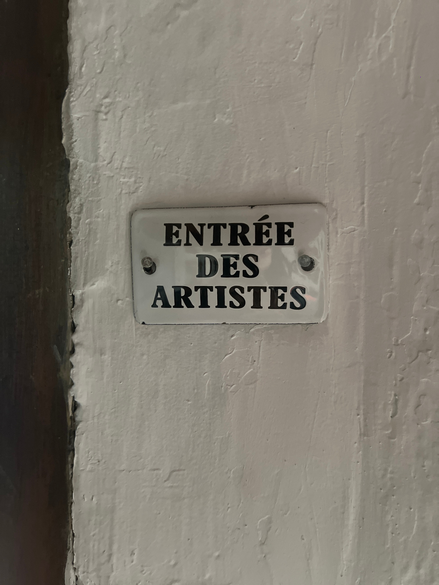 A close-up shot reveals a white, rectangular metal sign affixed to a textured white wall. The sign is emblazoned with black lettering, reading "ENTRÉE DES ARTISTES." Fastening the sign to the wall are…read more