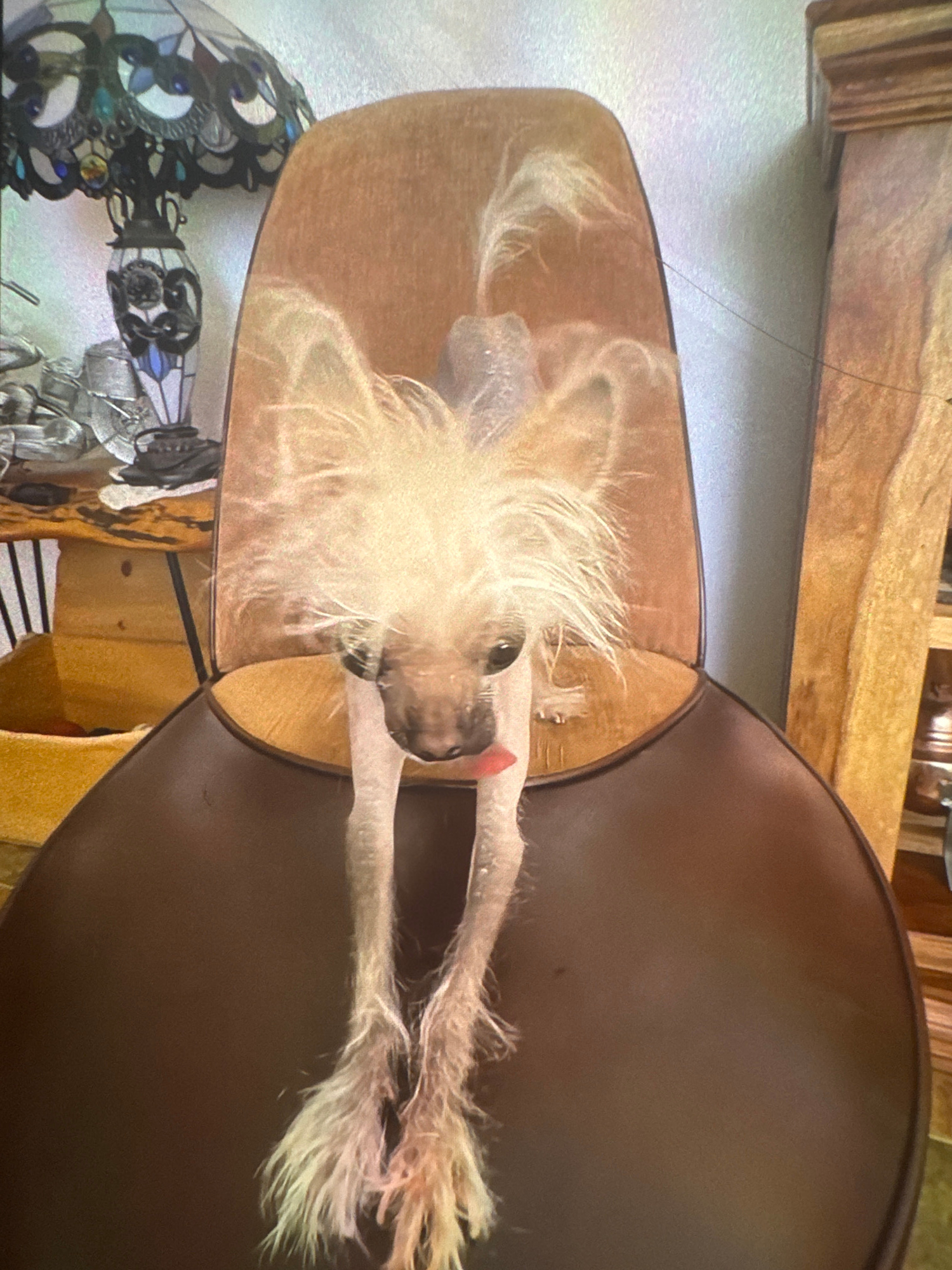 The image, rotated 90 degrees clockwise, features a small, light-colored dog, likely a Chinese Crested breed, relaxing indoors. The dog is positioned within a brown, bucket-shaped bed or basket, with…read more