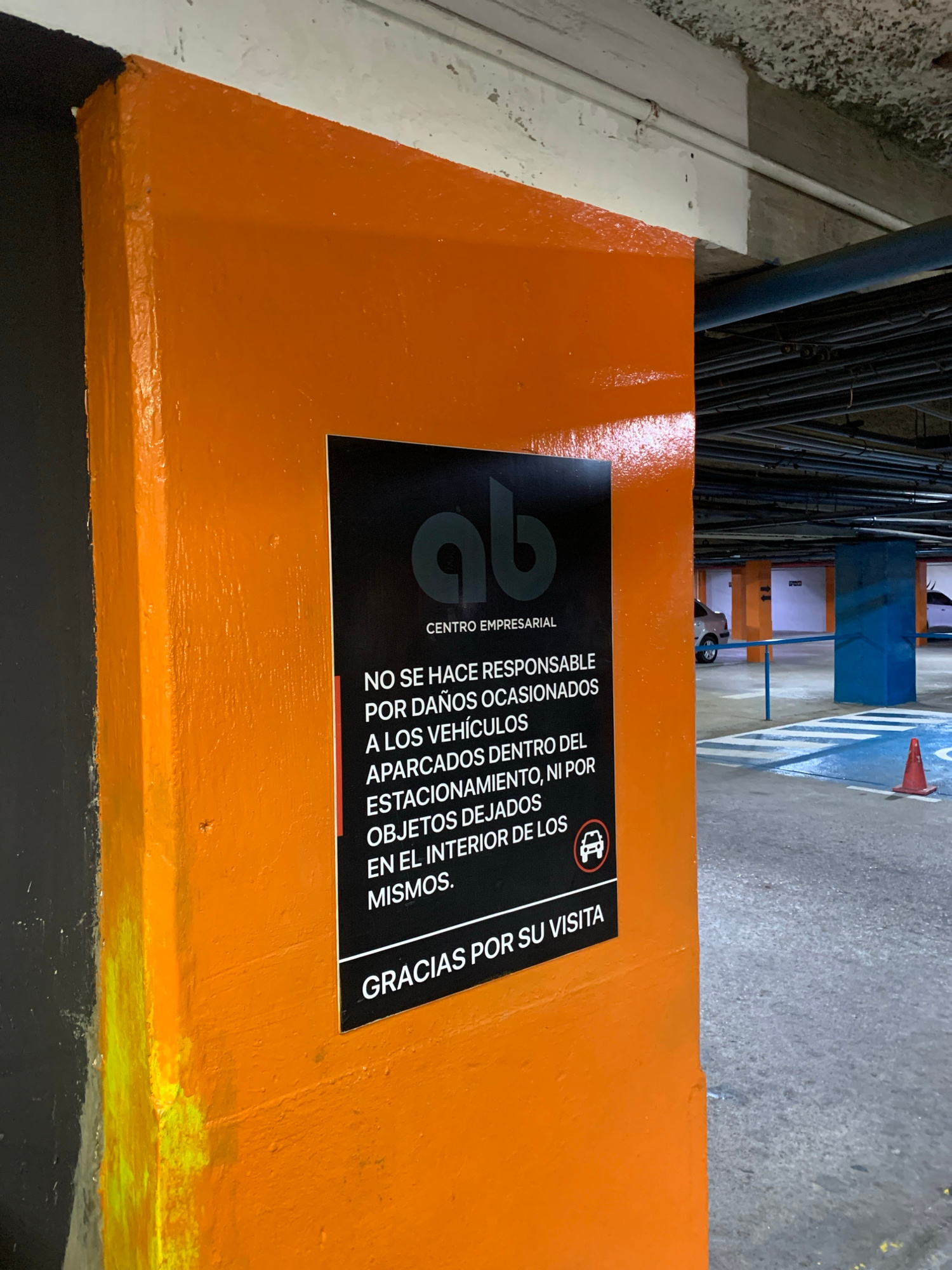 The image captures an indoor parking facility, as evidenced by the parking space markers, traffic cone, and automobiles in the background. In the foreground is an orange concrete support column bearin…read more