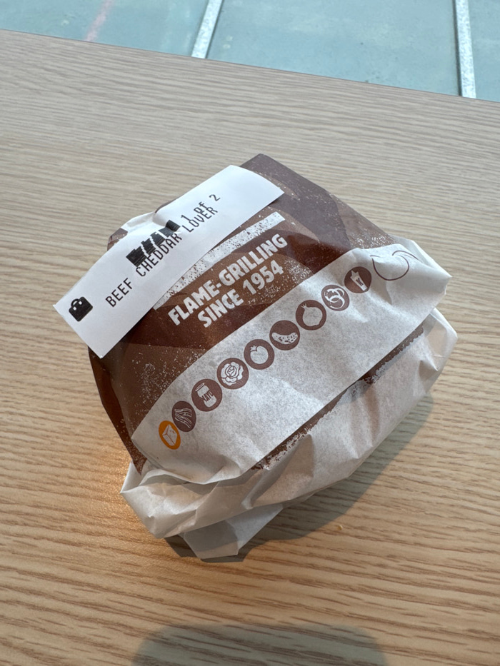 The image displays a single wrapped food item resting on a light-colored, wood-grain table surface. The item is predominantly covered in dark brown paper with white text stating "FLAME-GRILLING SINCE…read more