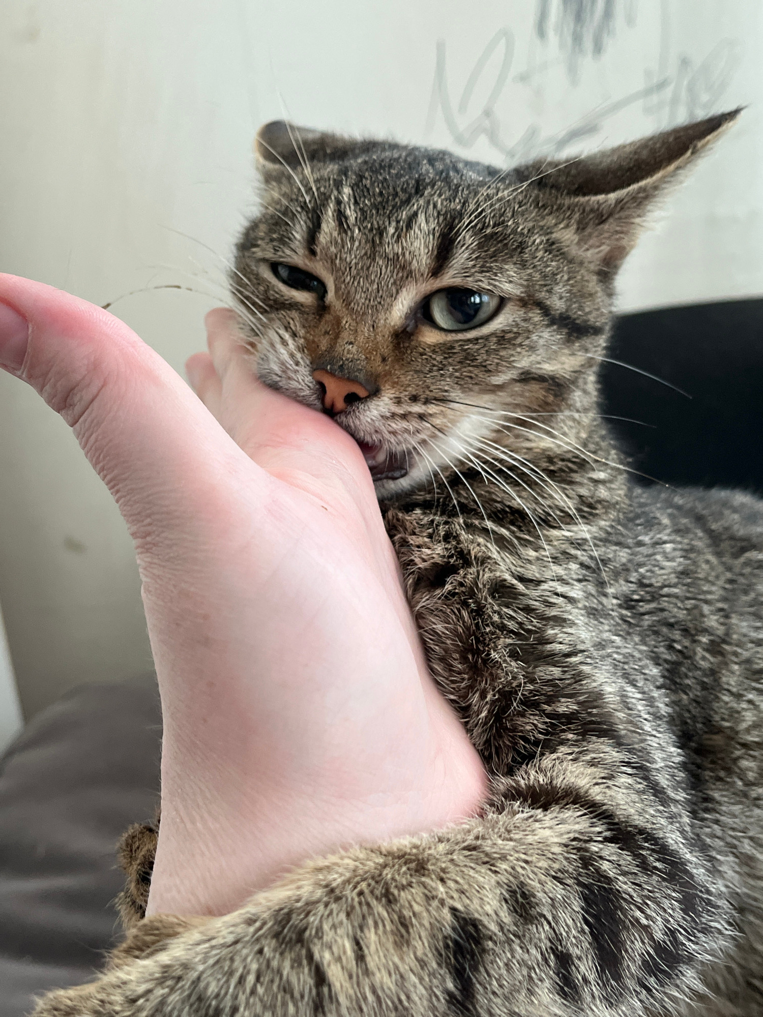 A tabby cat is biting the hand of a person. The cat is grey and black, with green eyes. The person's hand is light pink and white. The background is blurry. The location is not specified. The city men…read more