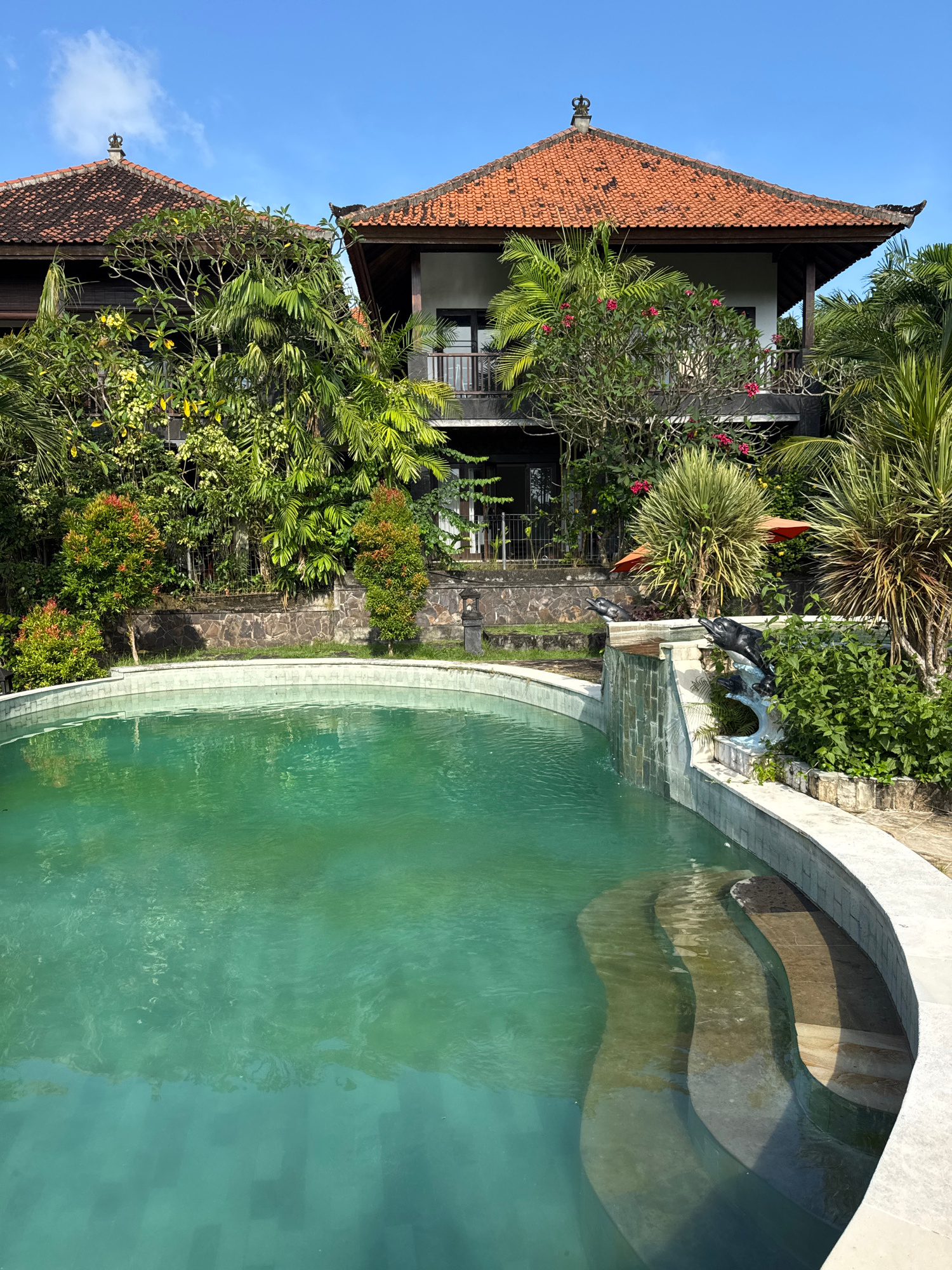 The image depicts a view of a pool and surrounding landscape in Ungasan, Indonesia. The pool is curved with multiple levels of steps leading into the water, which has a green hue. The pool is surround…read more
