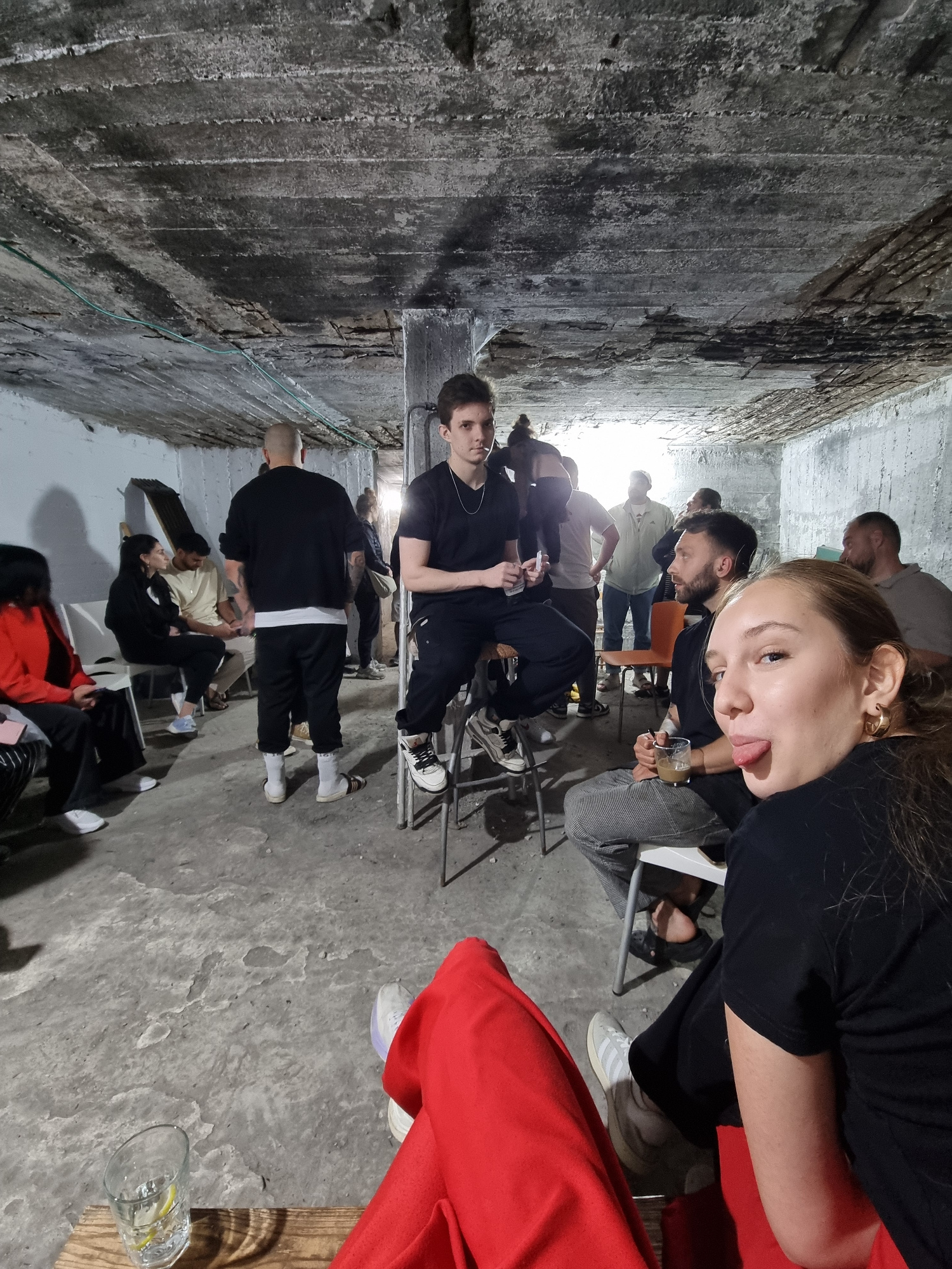 A group of people are seated on metal folding chairs in what appears to be an unfinished concrete tunnel or room with exposed rebar in the concrete walls. The people are dressed in casual clothing, wi…read more
