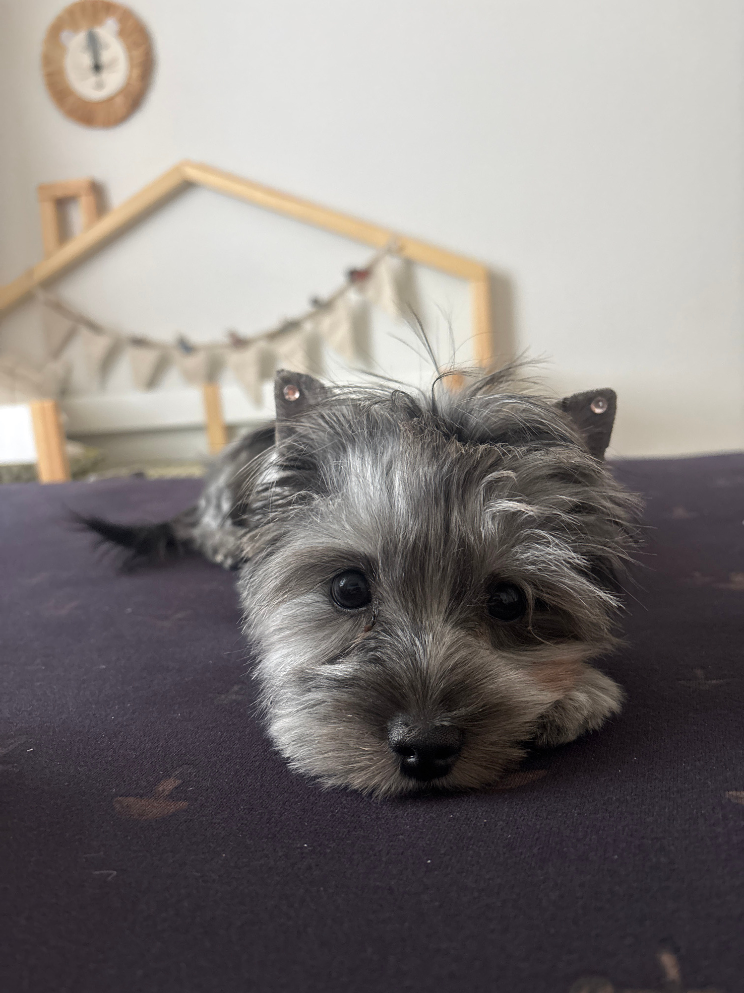 A close-up, slightly rotated image shows a gray and black small dog with floppy ears resting on a dark purple surface. The dog's face is the focal point, with its dark eyes looking directly at the cam…read more
