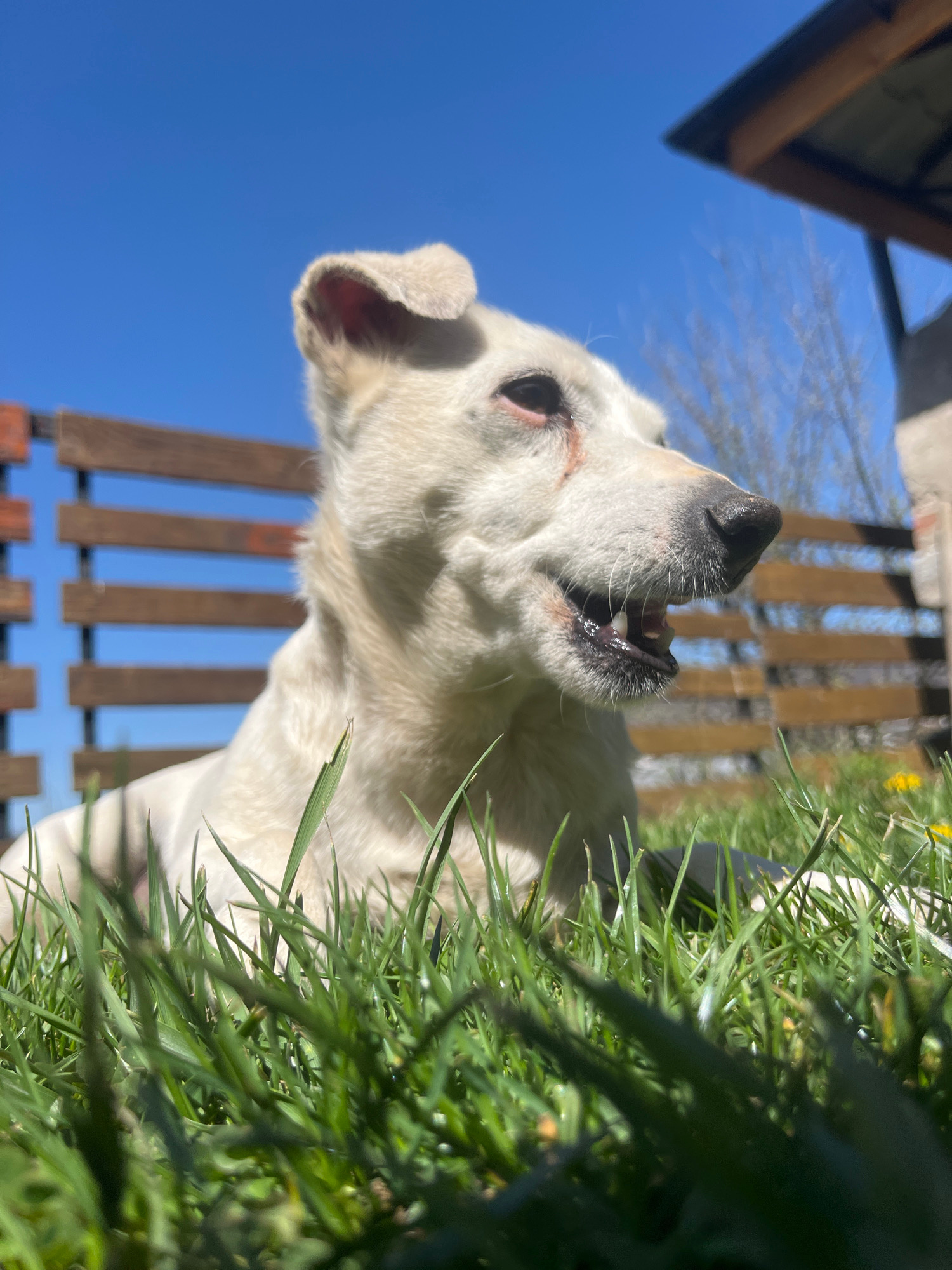 A close-up, low-angle photograph captures a white dog outdoors on a sunny day in Vladaya, Bulgaria. The dog, positioned horizontally across the frame with its head towards the right, looks down direct…read more
