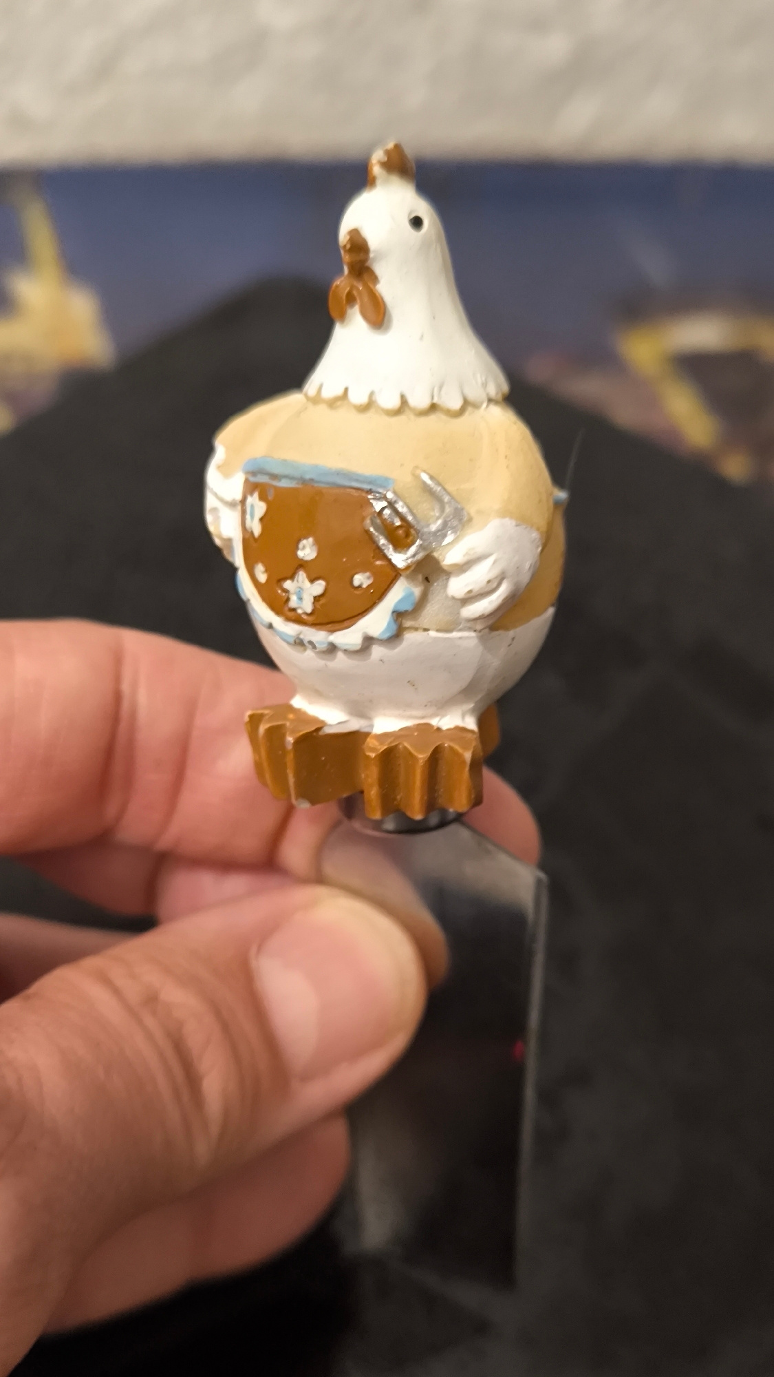 A hand holds a cheese knife featuring a chicken figurine. The figurine is primarily white and tan, with brown feet and a small brown apron adorned with white flowers. The knife blade is silver and rec…read more
