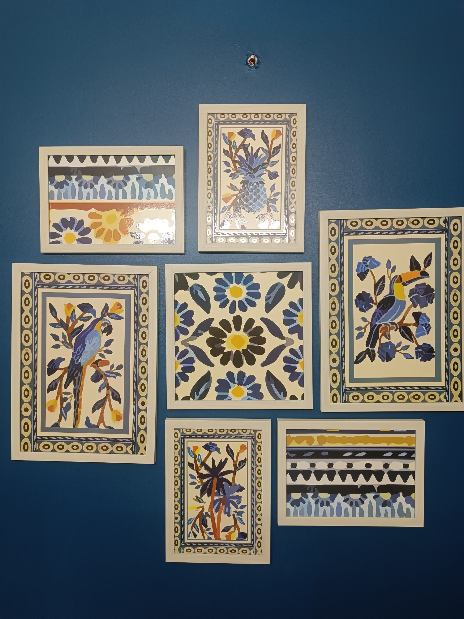 The image shows a wall with six framed prints arranged in a cluster. The wall is painted a solid, dark blue color. The frames appear to be white or off-white. The prints themselves vary in design, dep…read more
