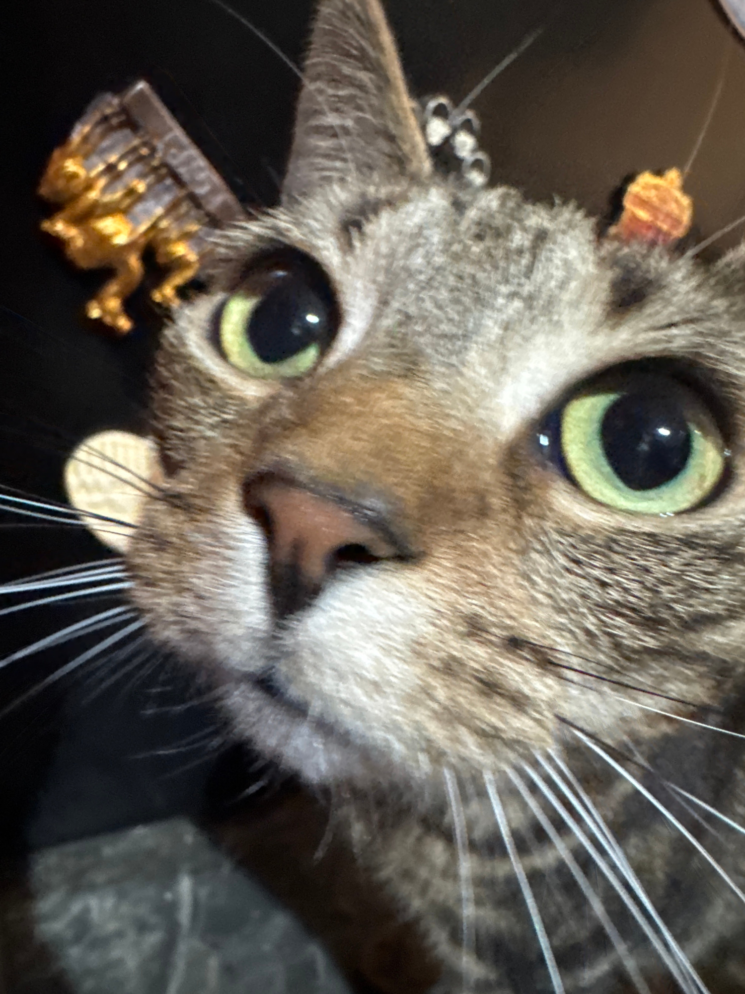 A close-up, high-angle shot focuses on a tabby cat's face. The cat has green eyes, a pink nose, and long white whiskers. Affixed to the cat's fur near its ears are various small, gold-colored objects:…read more