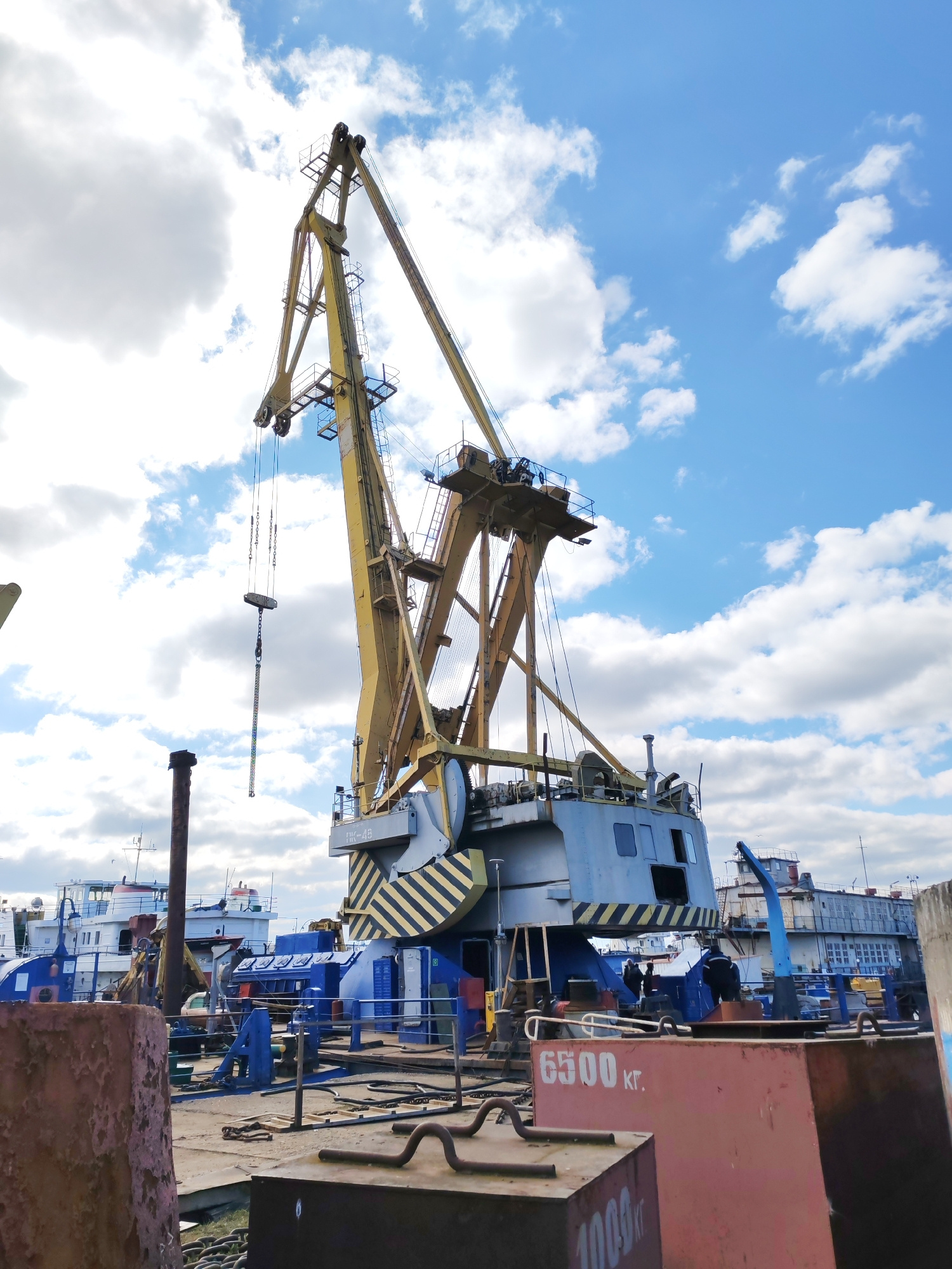 The image shows a large, yellow and gray port crane in Rybinsk, Russia. The crane has a capacity marking of "6500 кг" visible on a rusty metal structure in the foreground. In the background, there are…read more