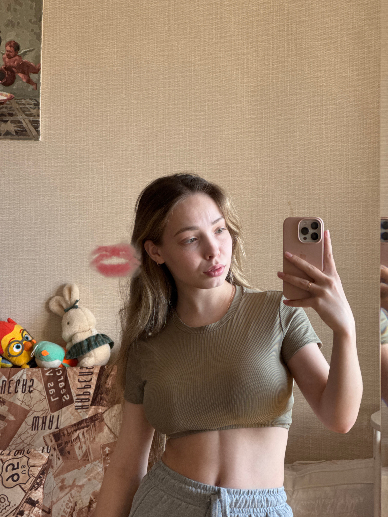 A woman is taking a selfie in a mirror. She is wearing a ribbed, short-sleeved top and gray sweatpants. She is holding a pink iPhone. A plush rabbit toy, a plush bird toy and an image depicting lip st…read more