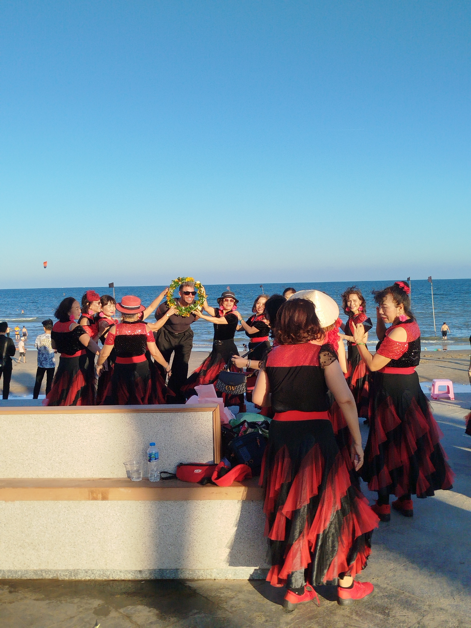 A group of people is gathered on a beach, with a clear blue sky and ocean as the backdrop. The group consists of women wearing matching red and black dresses, and a man standing in the center of the g…read more