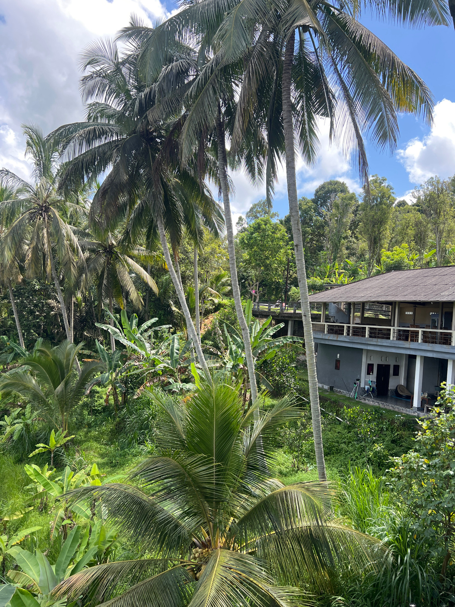 The image depicts a lush, tropical scene likely in Rendang, Indonesia. Dominating the foreground are numerous coconut palm trees, their trunks extending tall and slender, and fronds reaching upwards.…read more