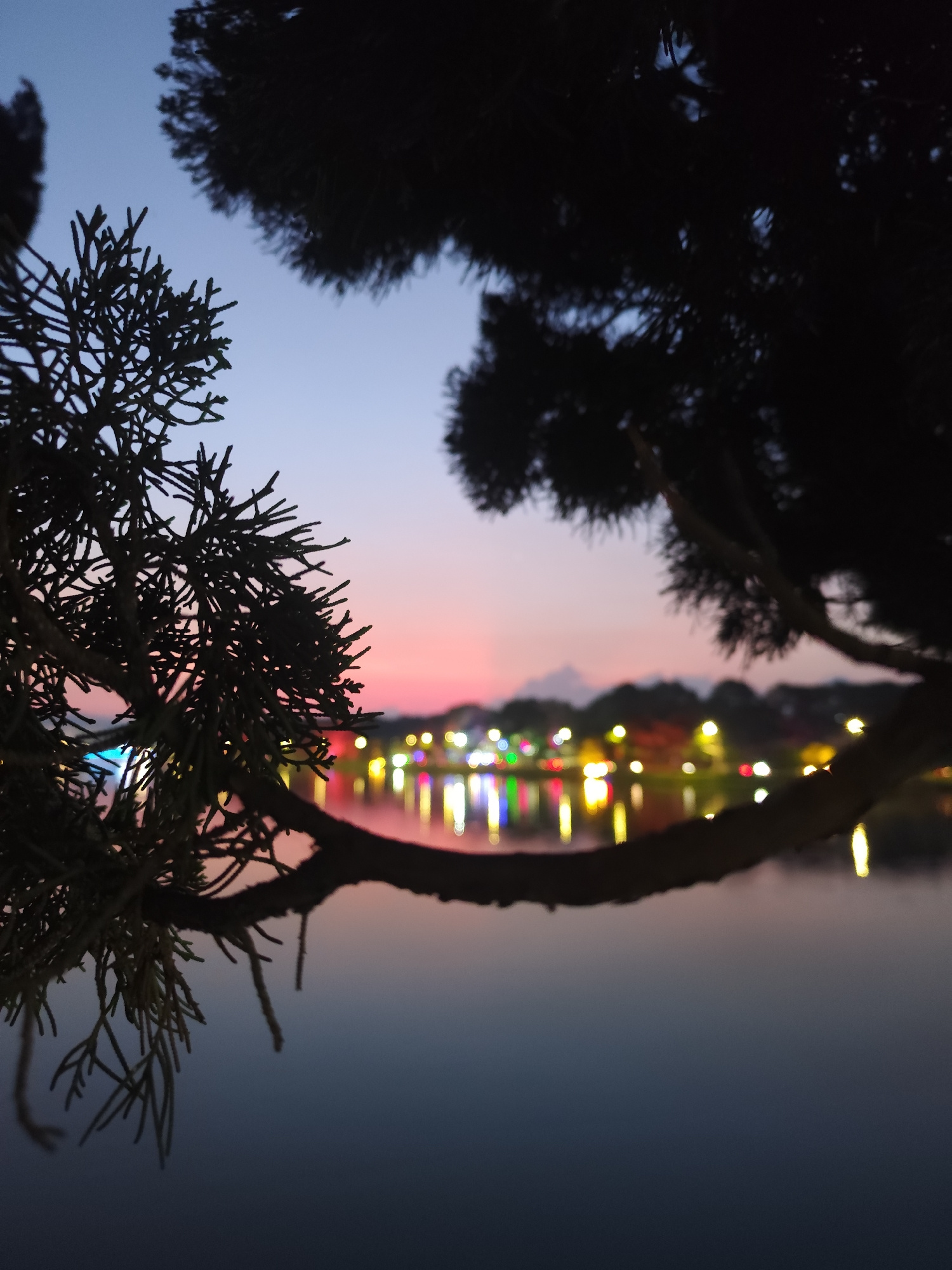 The image captures a tranquil scene at Xuan Huong Lake in Da Lat, Vietnam, during twilight. The sky transitions from a light blue at the top to a pinkish-red near the horizon. The focus is on the for…read more