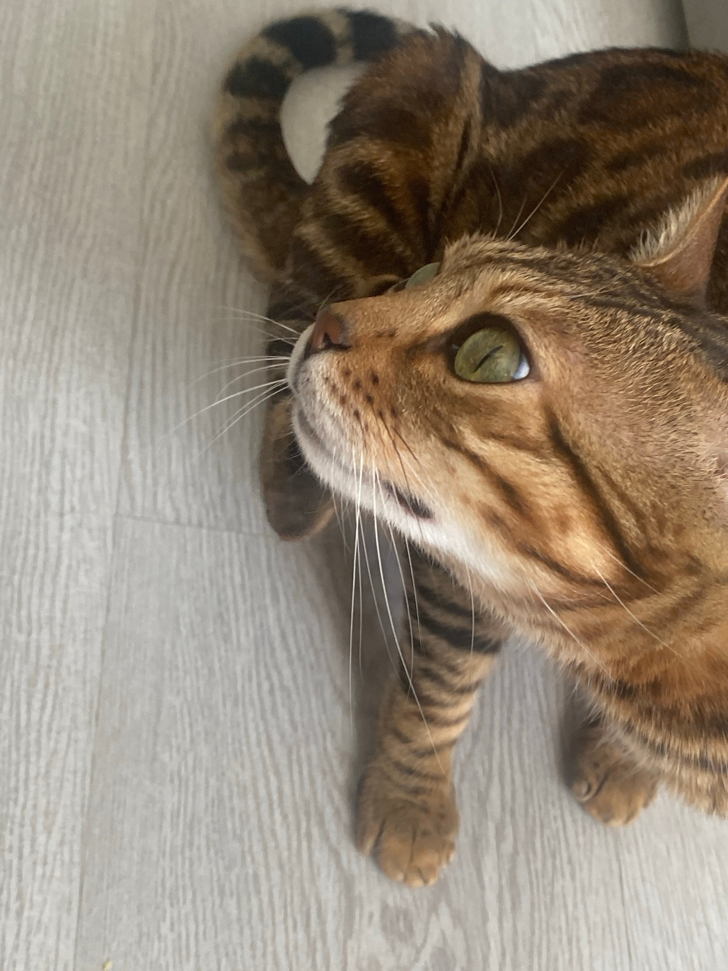 This media file presents a close-up, high-angle view of a Bengal cat resting indoors on a light-colored wooden floor. The cat's head is turned towards the left side of the frame, with its large, strik…read more