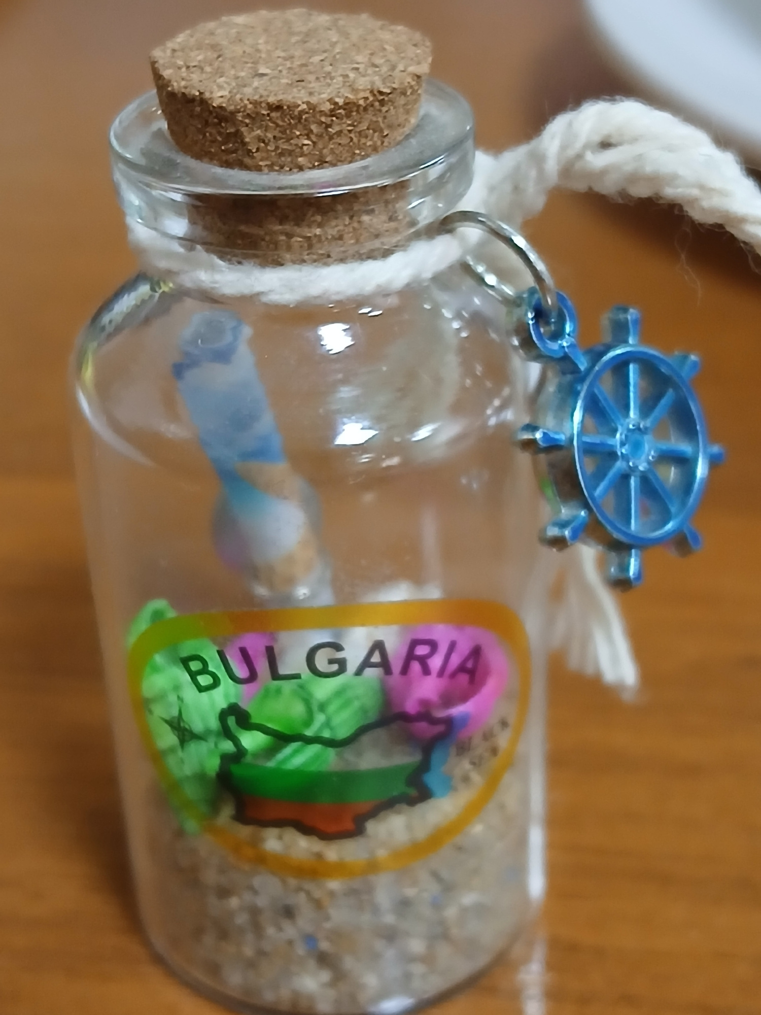 The image shows a souvenir bottle filled with sand, likely from Bulgaria, resting on a wooden surface. The bottle is sealed with a cork and has a small, rolled-up piece of paper inside. A blue, decora…read more