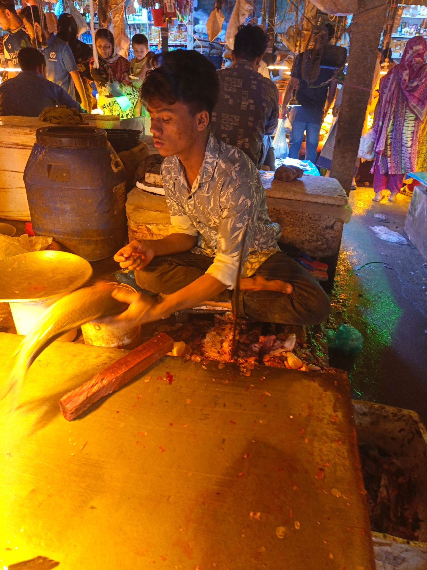 A fishmonger sits on a concrete ledge in Dhaka, Bangladesh, preparing fish at a market stall. He wears a patterned gray shirt and dark pants, seated cross-legged. A large yellow fish is being prepared…read more