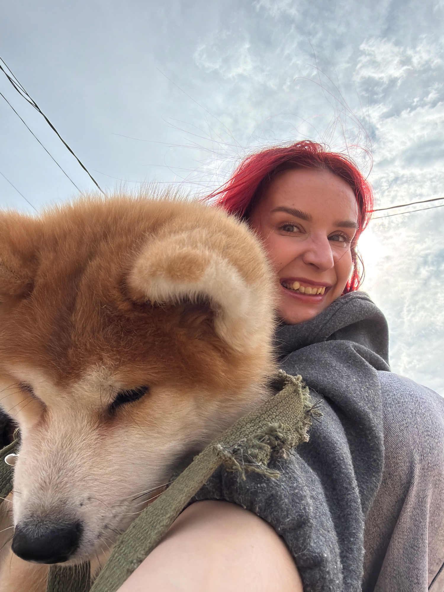An eye-level selfie captures a smiling person with red hair alongside a light brown dog, looking up towards a cloudy sky. The image is taken from a low angle, emphasizing the bright, partially overcas…read more