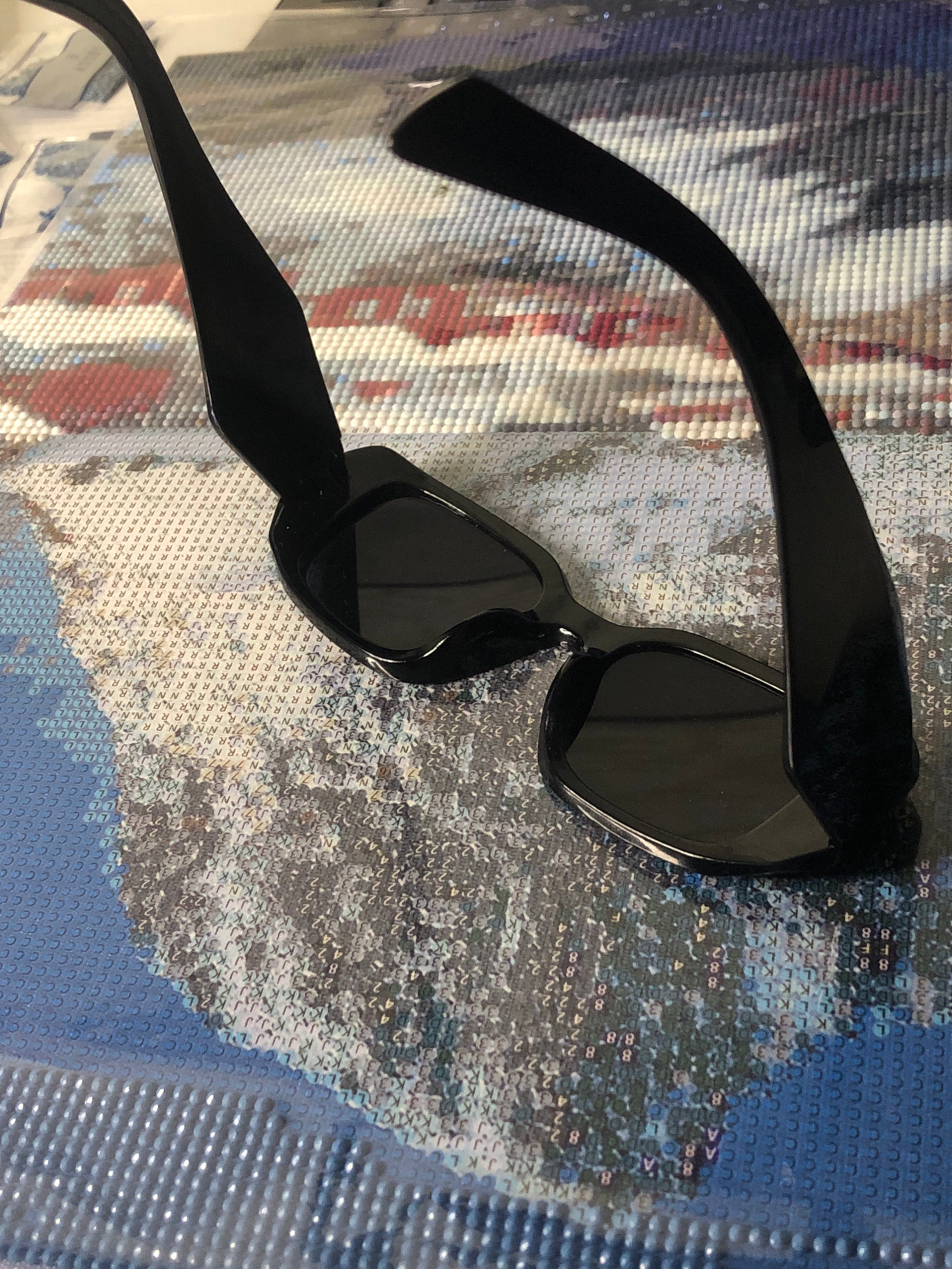 The image shows a pair of black sunglasses resting on a surface with a mosaic-like pattern of small shapes. The mosaic includes colors such as blue, white, grey, red, and dark shades. The sunglasses a…read more