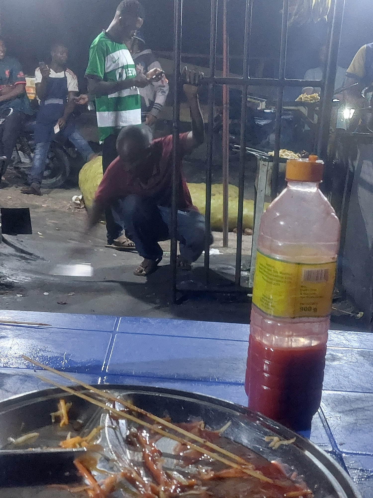 This is a nighttime street scene in Dar es-Salaam, Tanzania. The focus includes a metal cage behind which people mill around. In the cage, a man in a red shirt and dark pants bends over. In front of t…read more