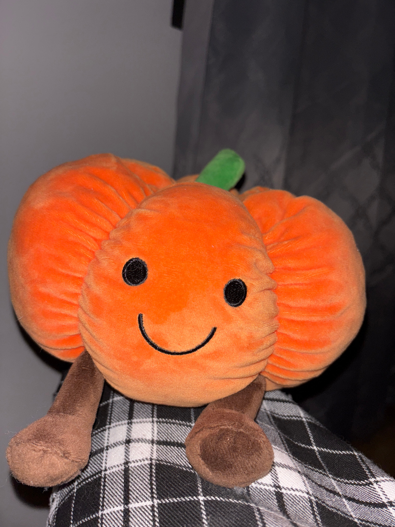 A plush toy resembling a stack of pumpkins is positioned in front of a black and white plaid fabric. The toy features two orange, rounded sections stacked atop each other, with a green stem extending…read more