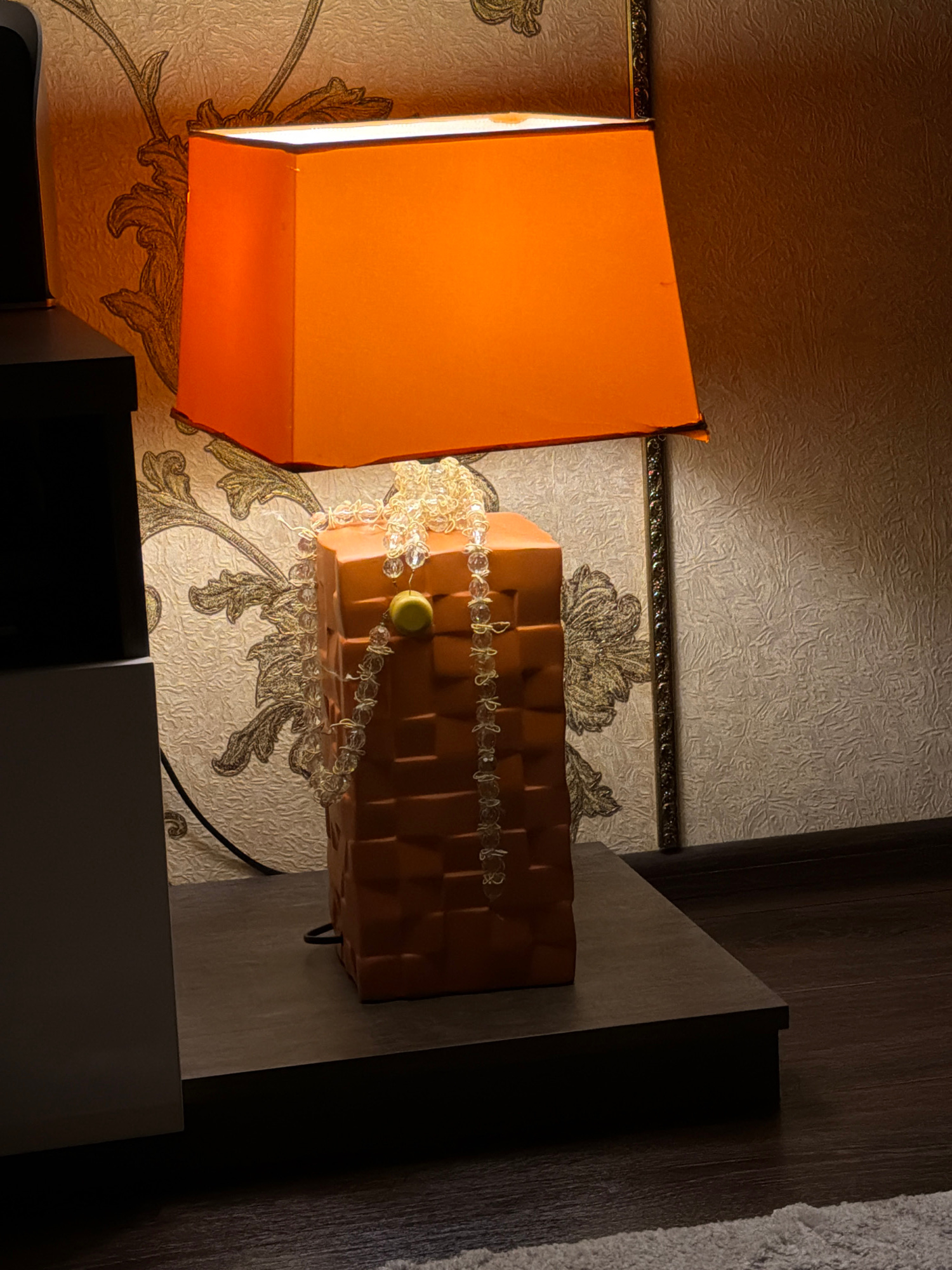 A high-angle shot depicts a room in Penza, Russia, featuring a patterned wallpaper, an orange lampshade, a decorative brick-shaped object adorned with a beaded garland, and a dark-toned cabinet. The l…read more