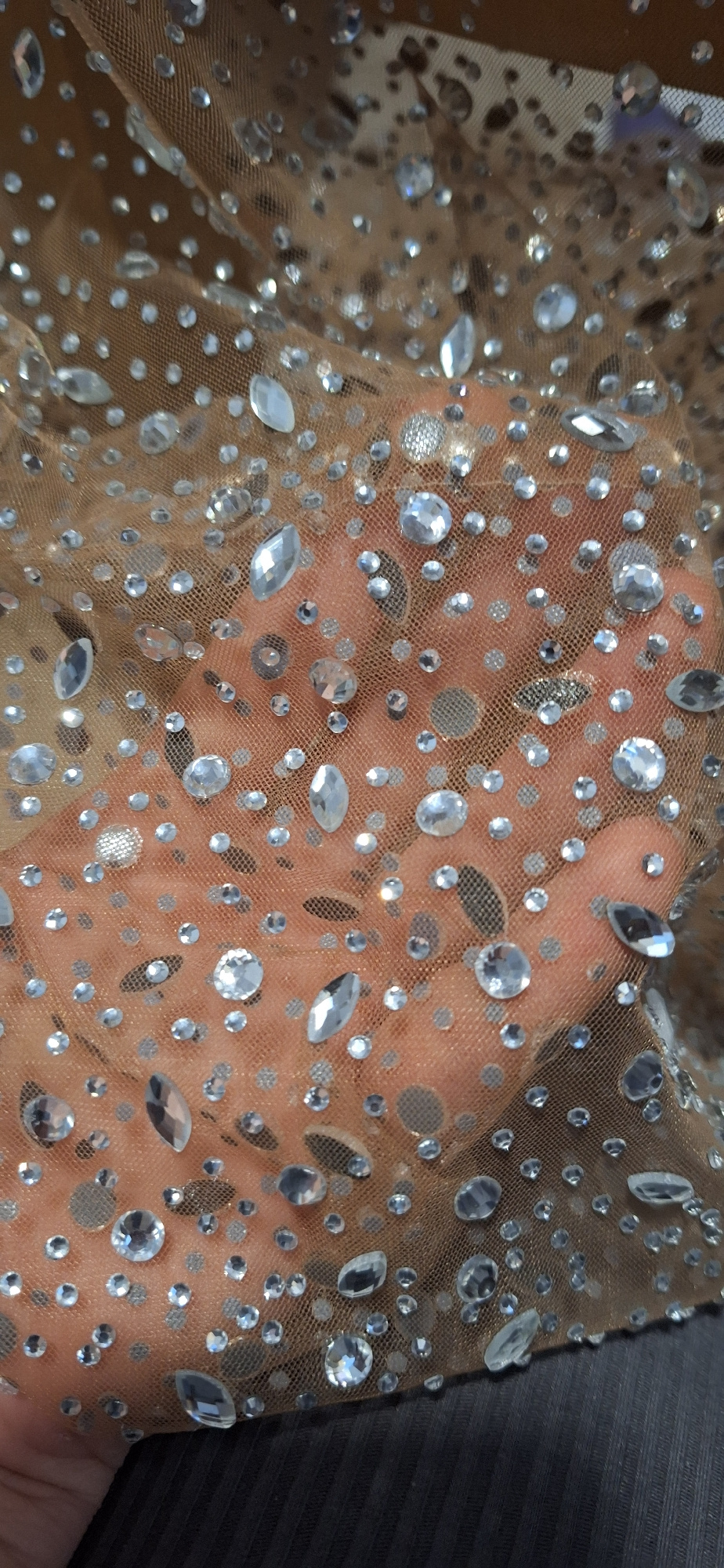 A close-up, high-angle shot features a piece of sheer, light brown or nude-colored mesh fabric adorned with numerous clear, sparkling rhinestones and smaller silver embellishments. A human hand, likelβ¦read more