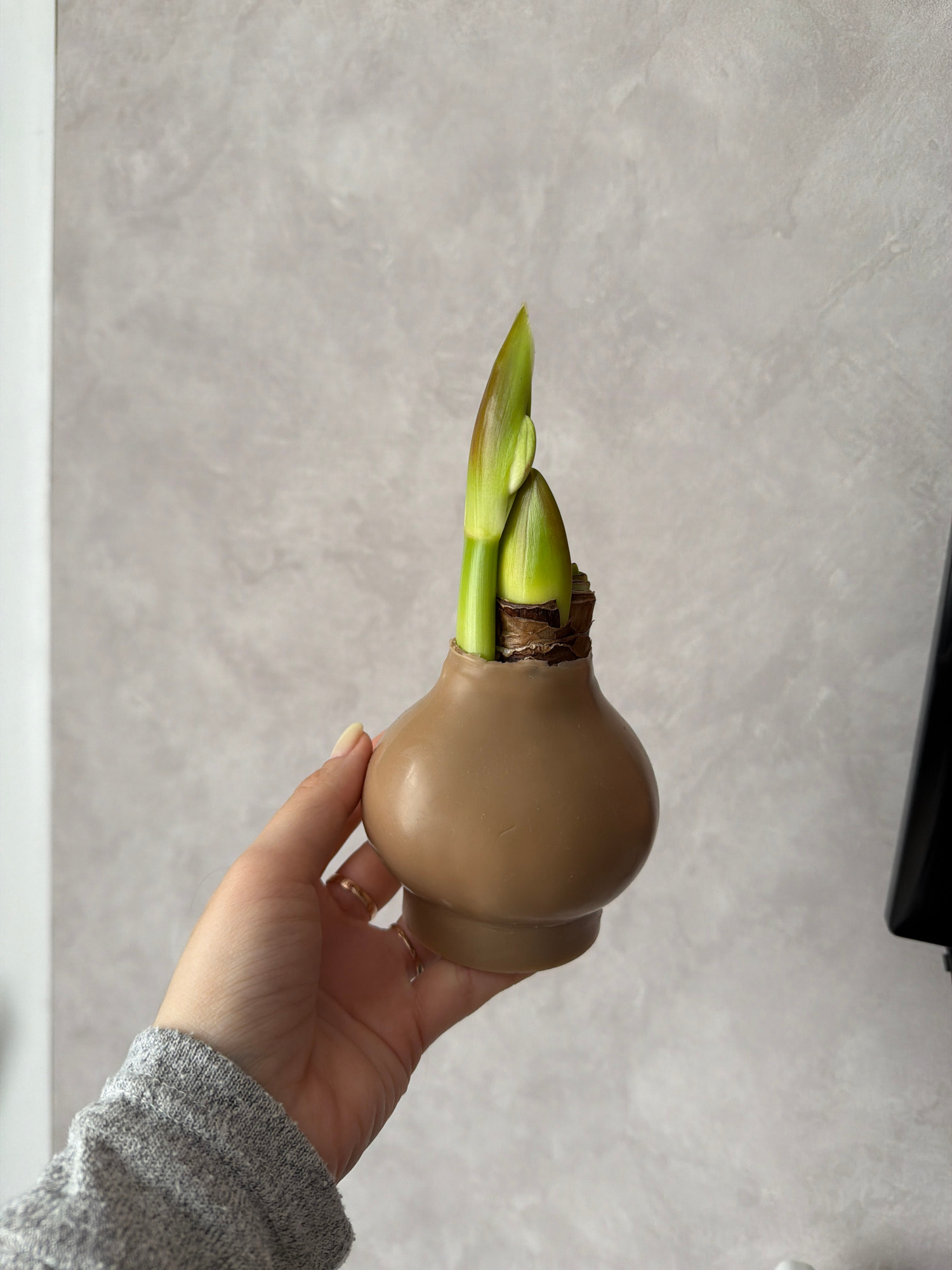 A hand holds a brown, pot-shaped vase containing a green amaryllis bulb with growing shoots. The background features a light gray wall and a white surface. Part of a dark object is visible at the top…read more