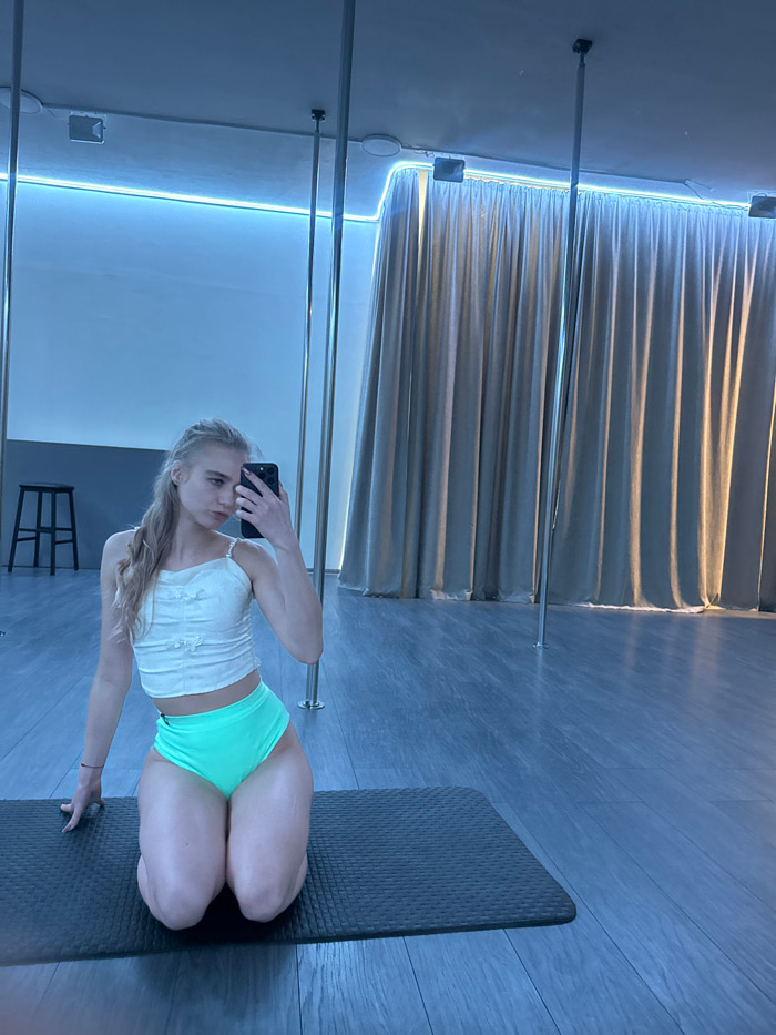The scene depicts a young female in a pole fitness studio. She is light-skinned with blonde hair, styled in a braid over her left shoulder. She is kneeling on a dark grey exercise mat, wearing a white…read more