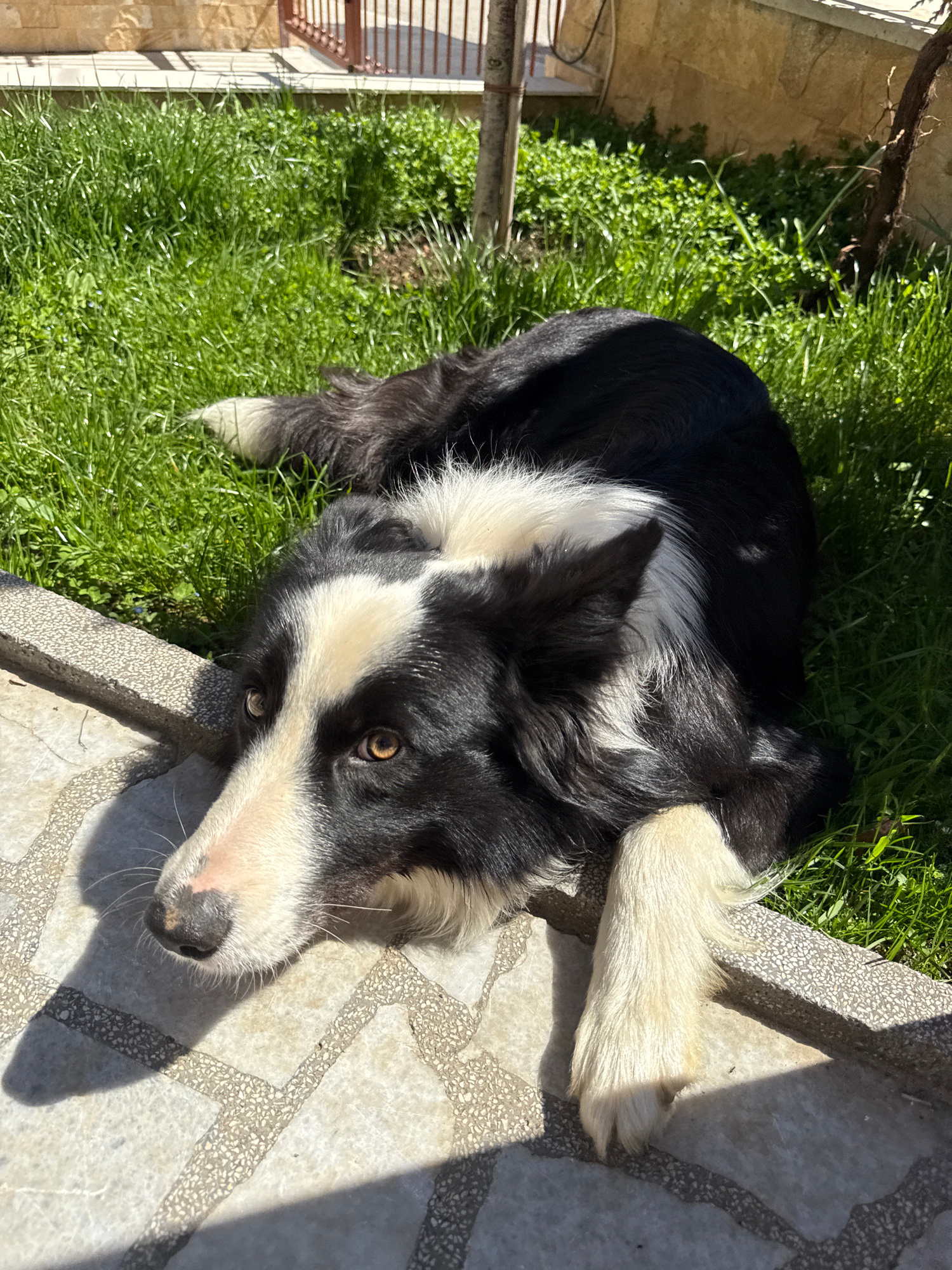 A Border Collie dog lies on a patio next to a patch of grass in an outdoor setting. The dog is predominantly black and white with a white face and white paws. The dog's coat is primarily black with wh…read more