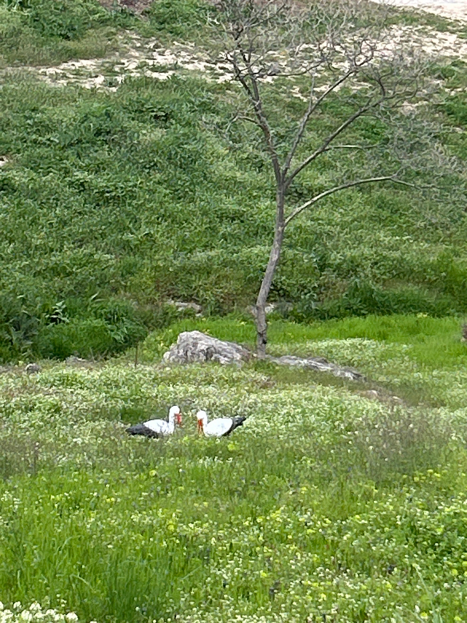 The image captures a serene outdoor scene, likely a natural landscape in Hisarya, Bulgaria, characterized by lush greenery and sparse trees. The primary subjects are two storks standing on a verdant,…read more