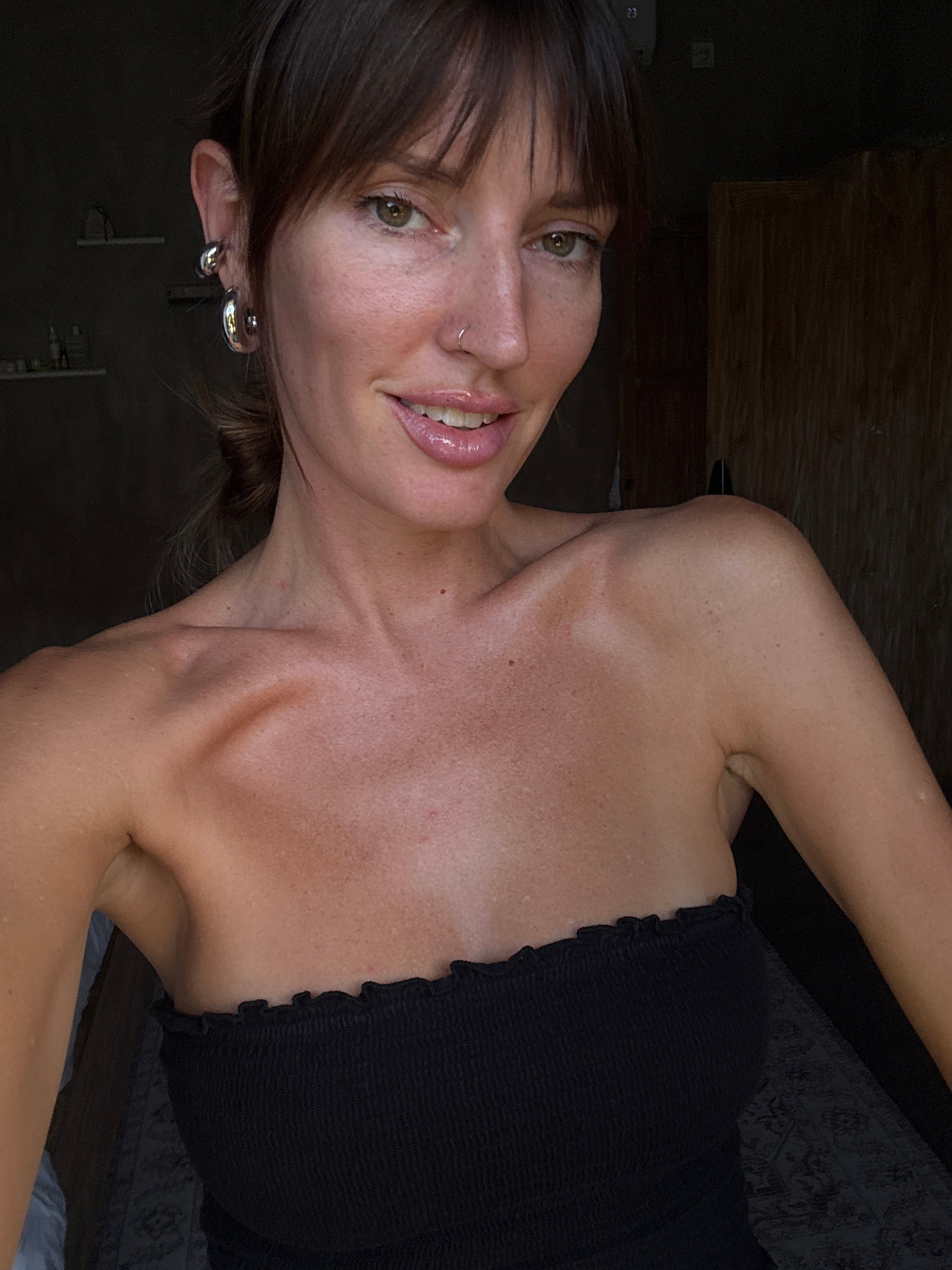 The image shows a woman with brown hair and light skin wearing a black strapless top. She has earrings and a nose ring. The background includes a wooden cabinet, a dark wall, and what appears to be a…read more