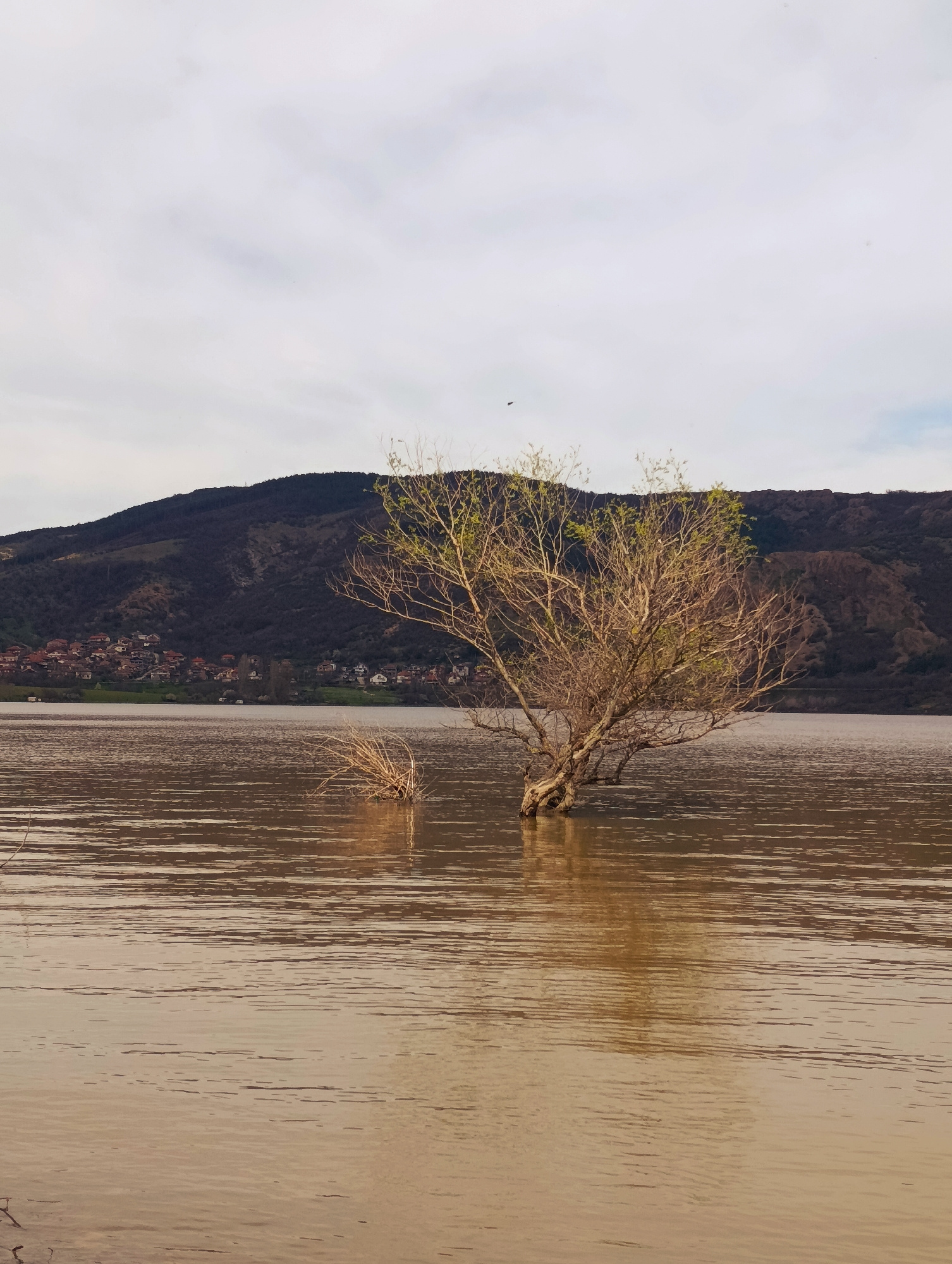 The image shows a flooded landscape in Shiroko pole, Bulgaria. A bare tree stands in the middle of the water, its lower branches submerged. A cluster of dry vegetation is nearby, also partially submer…read more