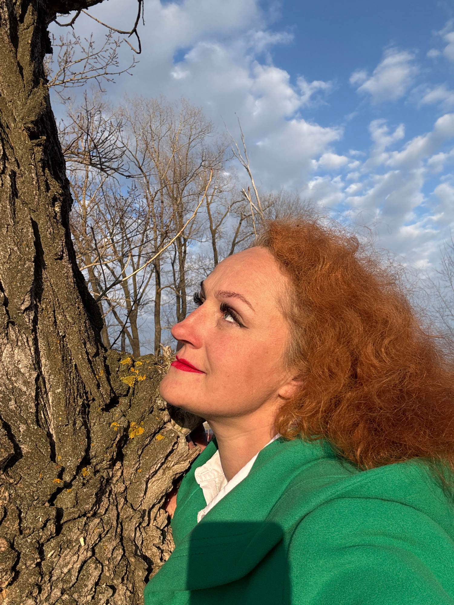 A woman with red, curly hair, wearing a green jacket over a white shirt, is positioned to the right of the frame, with her face turned downwards and slightly to the left. She has red lipstick and appe…read more