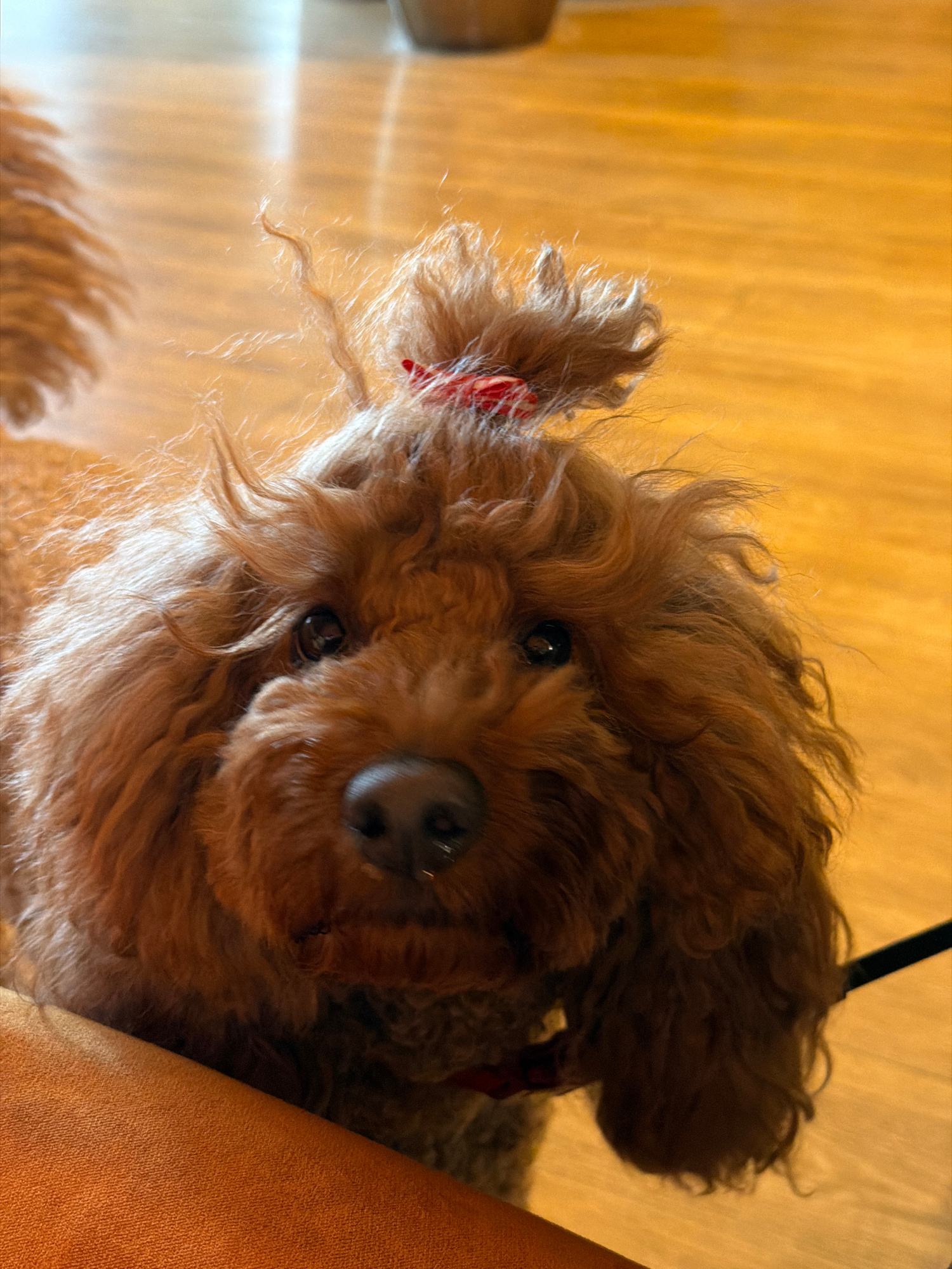 A close-up, slightly tilted, indoor photograph shows a brown toy poodle with a red bow tied in a topknot of hair on its head. The dog's face, including its dark eyes and shiny black nose, is the prima…read more