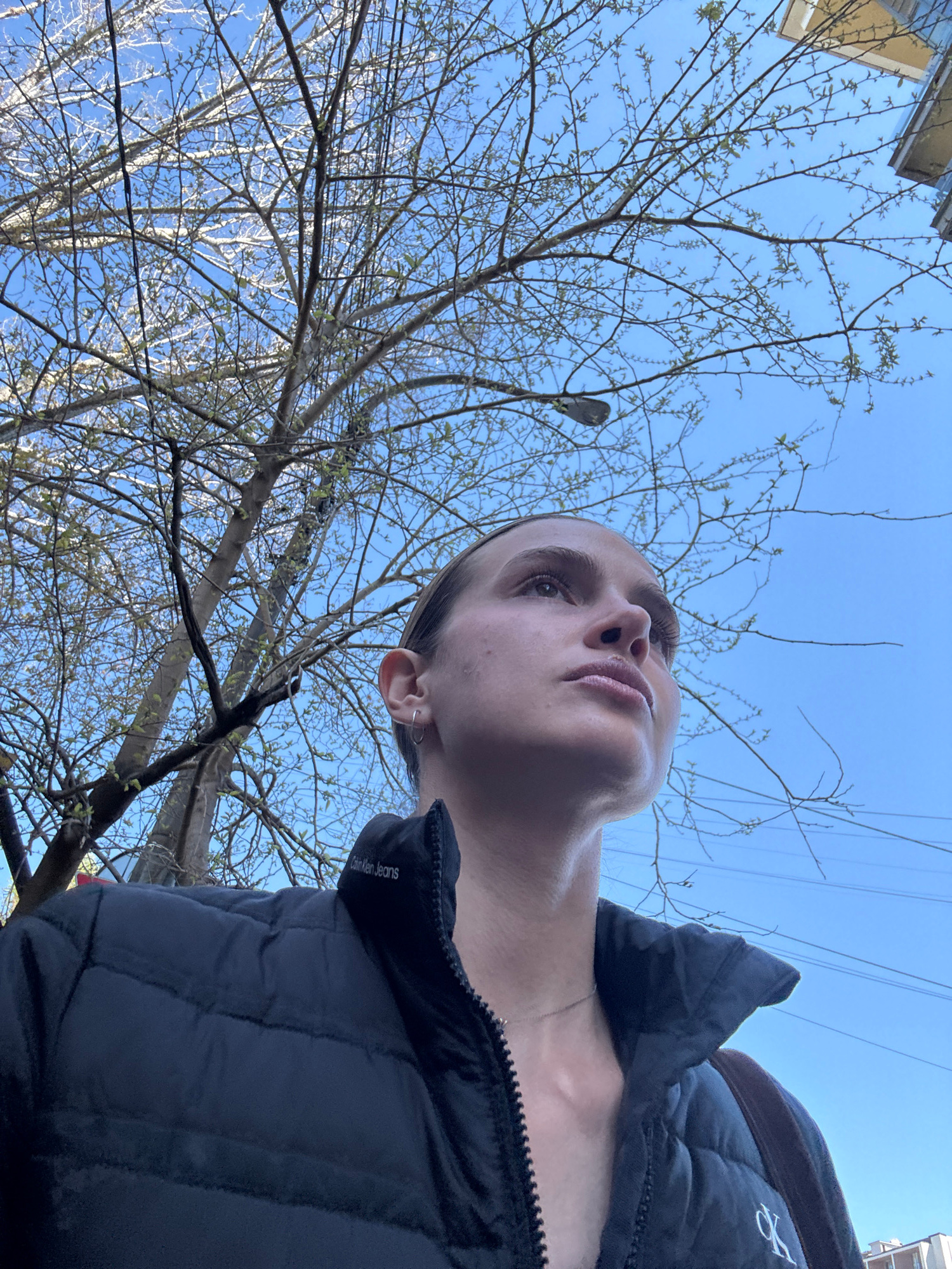 A low-angle shot looks up at a person and trees against a bright blue sky. The person, likely female, has their face tilted upwards and is wearing a black puffy jacket with a visible Calvin Klein Jean…read more