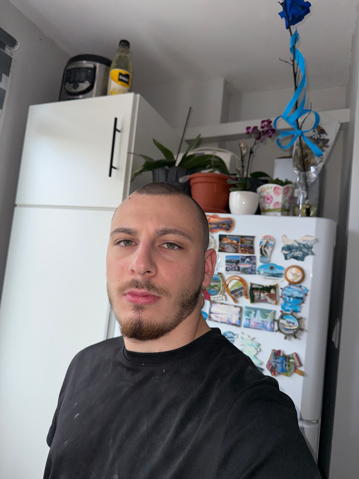 A medium shot shows a man with closely cropped dark hair, a neatly trimmed beard, and fair skin wearing a black t-shirt. The background indicates an indoor kitchen setting, with white cabinetry and a…read more