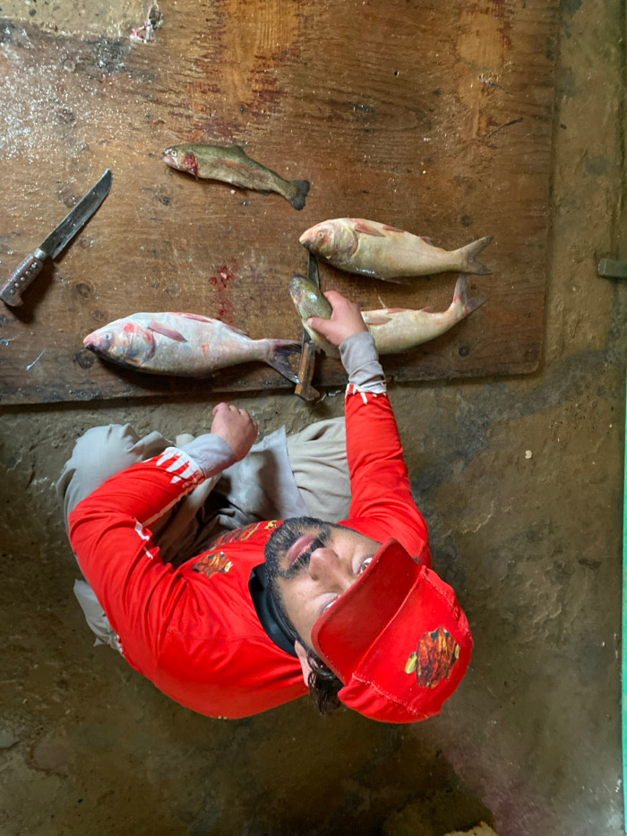 The image depicts a man preparing fish on a wooden surface in Deh Sabzi, Afghanistan. The scene is viewed from an overhead perspective, showing a male individual with a beard and dark hair, wearing a…read more