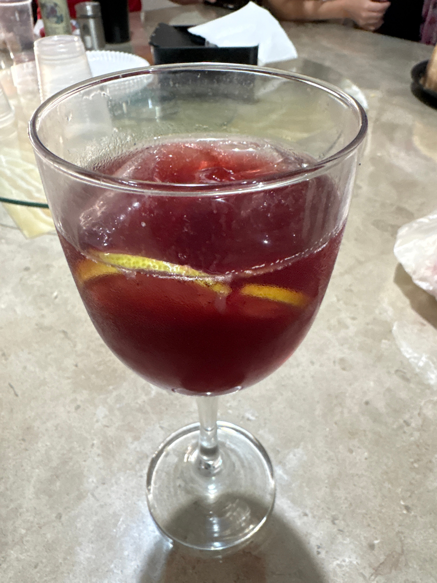 The image shows a wine glass filled with a dark red liquid, possibly sangria or red wine, with slices of fruit visible inside the glass. The glass has condensation on the outside, indicating that it i…read more