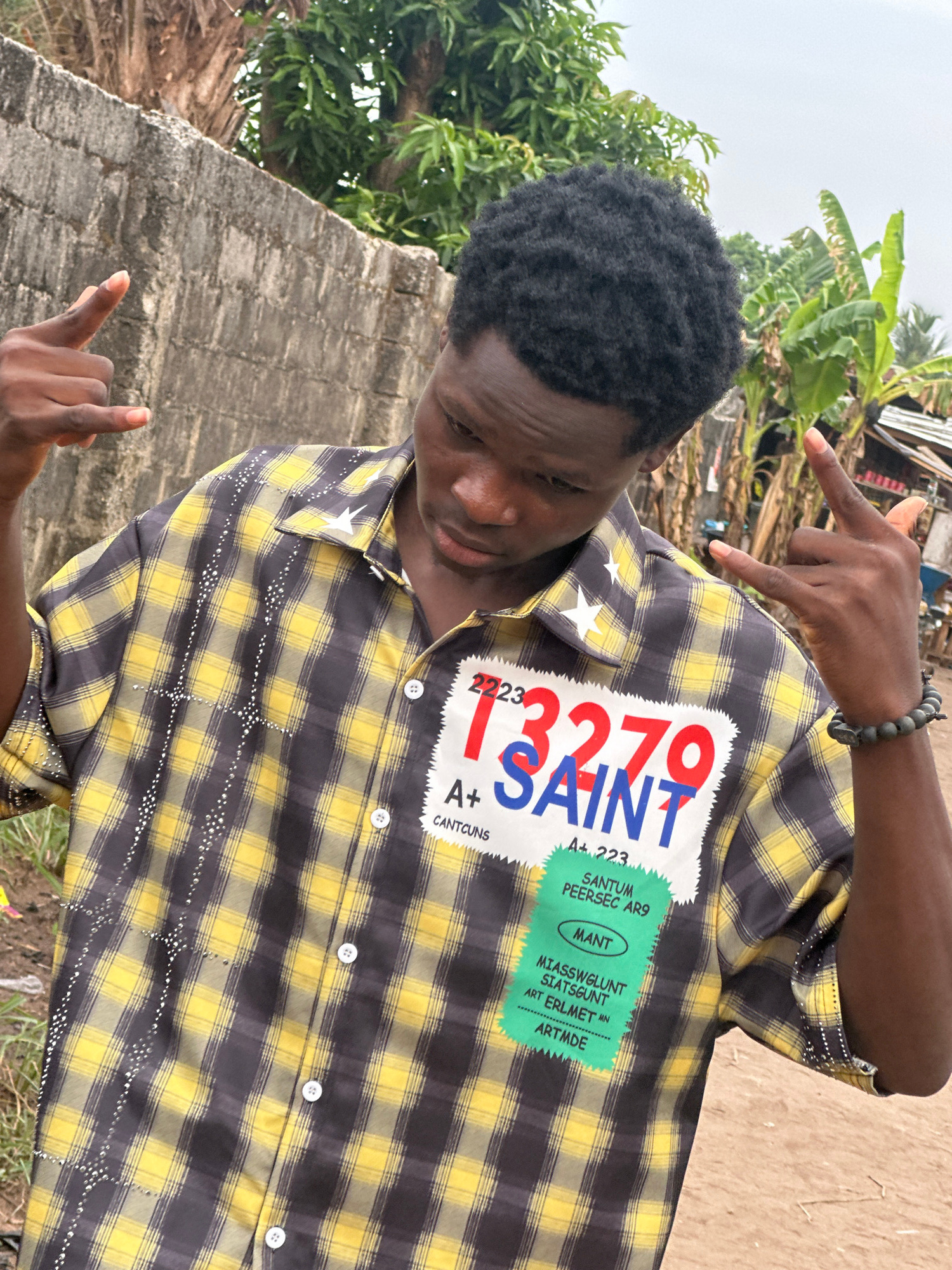 A young dark-skinned male is captured in a half-body shot, posing outdoors in Ihiagwa, Nigeria. He wears a short-sleeved, collared shirt featuring a black and yellow plaid pattern with white buttons dā¦read more