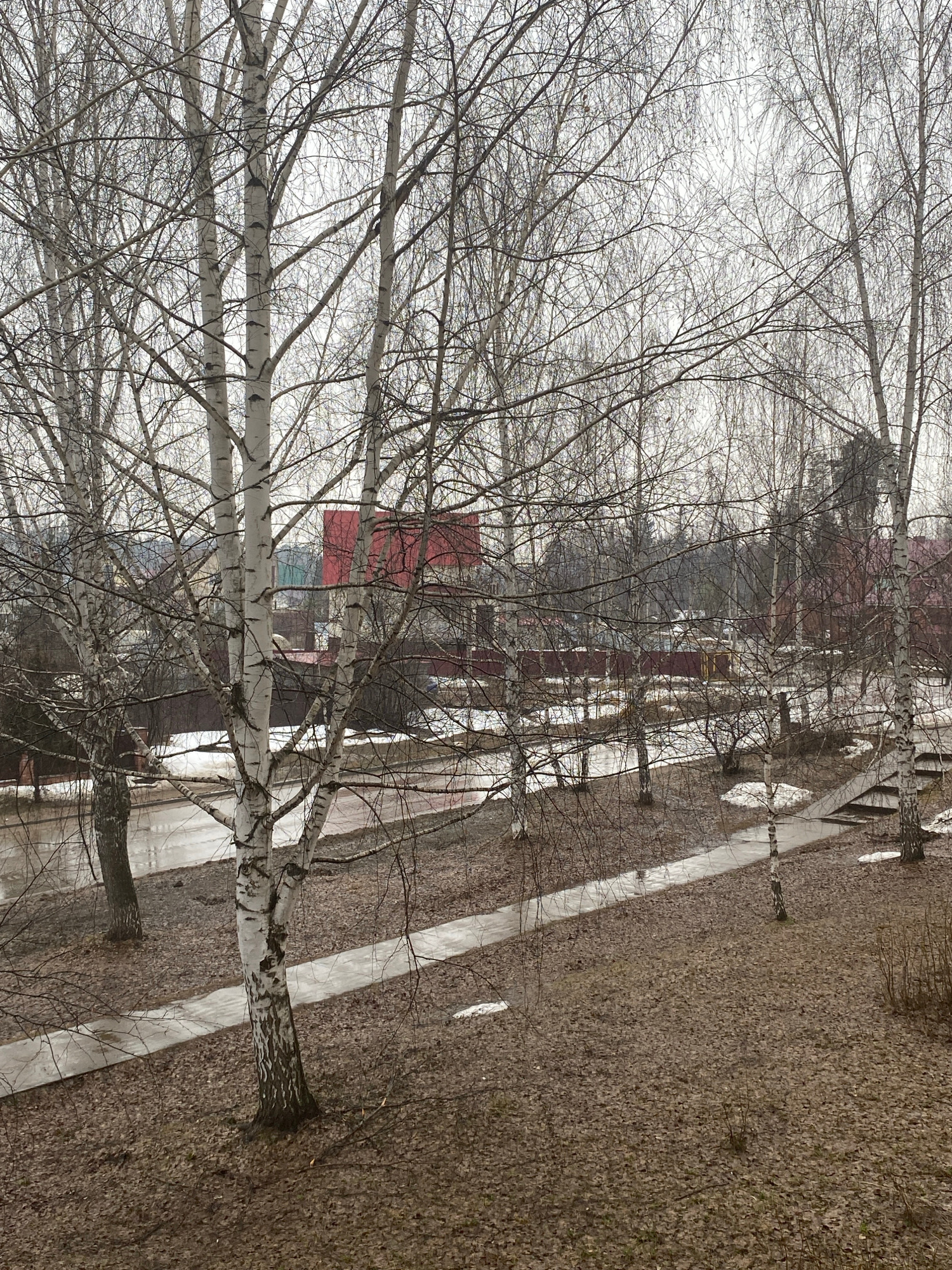 The image shows a row of birch trees in Noviy, Russia, likely in late winter or early spring. The trees are bare of leaves, with their white bark prominently displayed. A path, partially covered with…read more