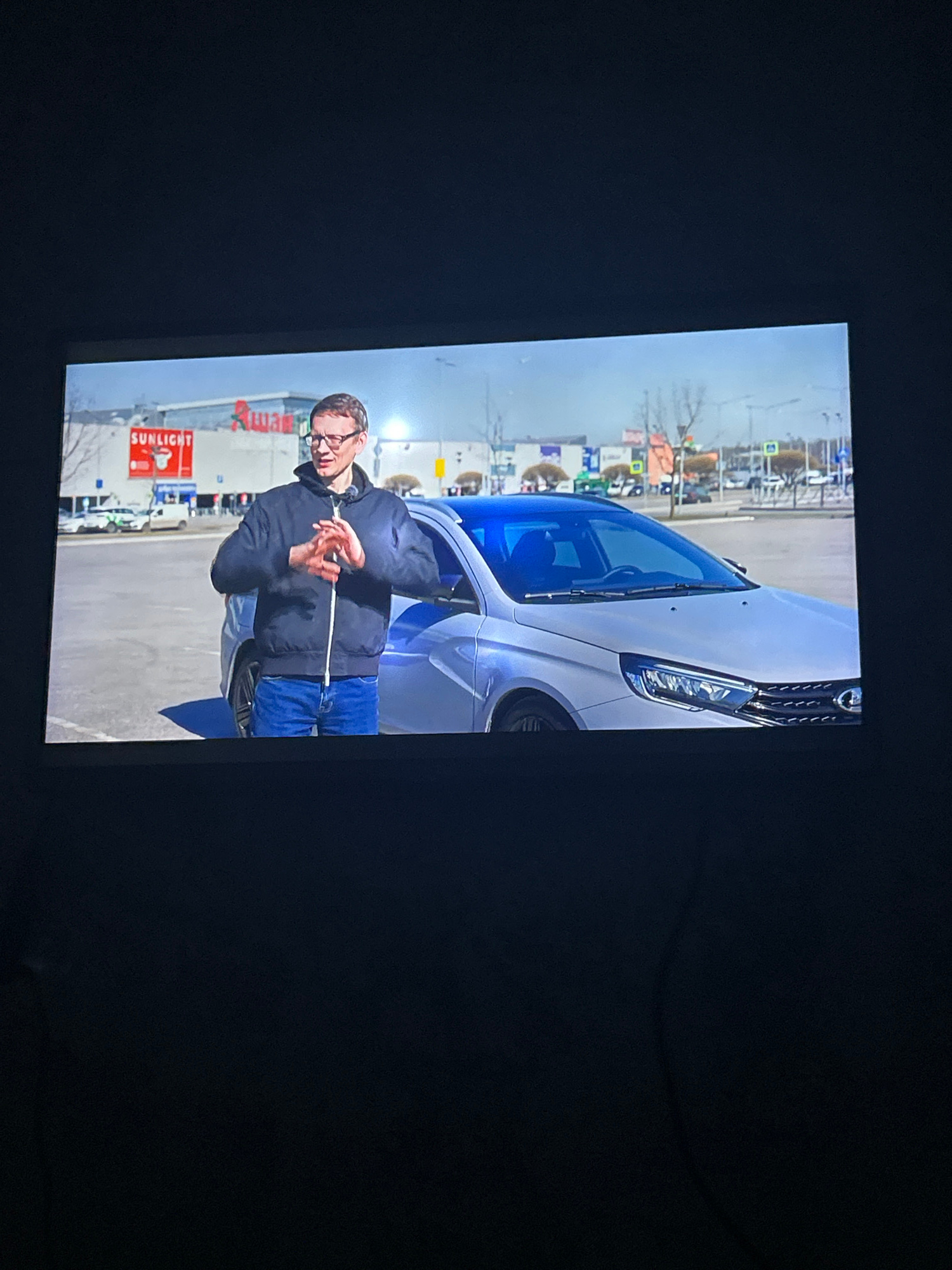 A man stands next to a white van in what appears to be a parking lot in Chaikovsky, Russia. The man wears glasses, a dark jacket, and blue jeans. He is holding a thin white object, possibly a measurin…read more
