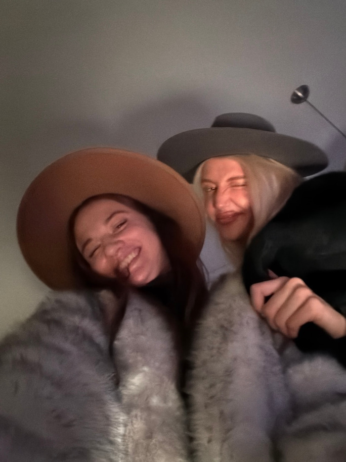 Two women wearing hats and furry coats are angled close to the camera. The woman on top has blond hair and a gray hat. The woman on the bottom has brown hair and a tan hat. Both are smiling. A dark ja…read more