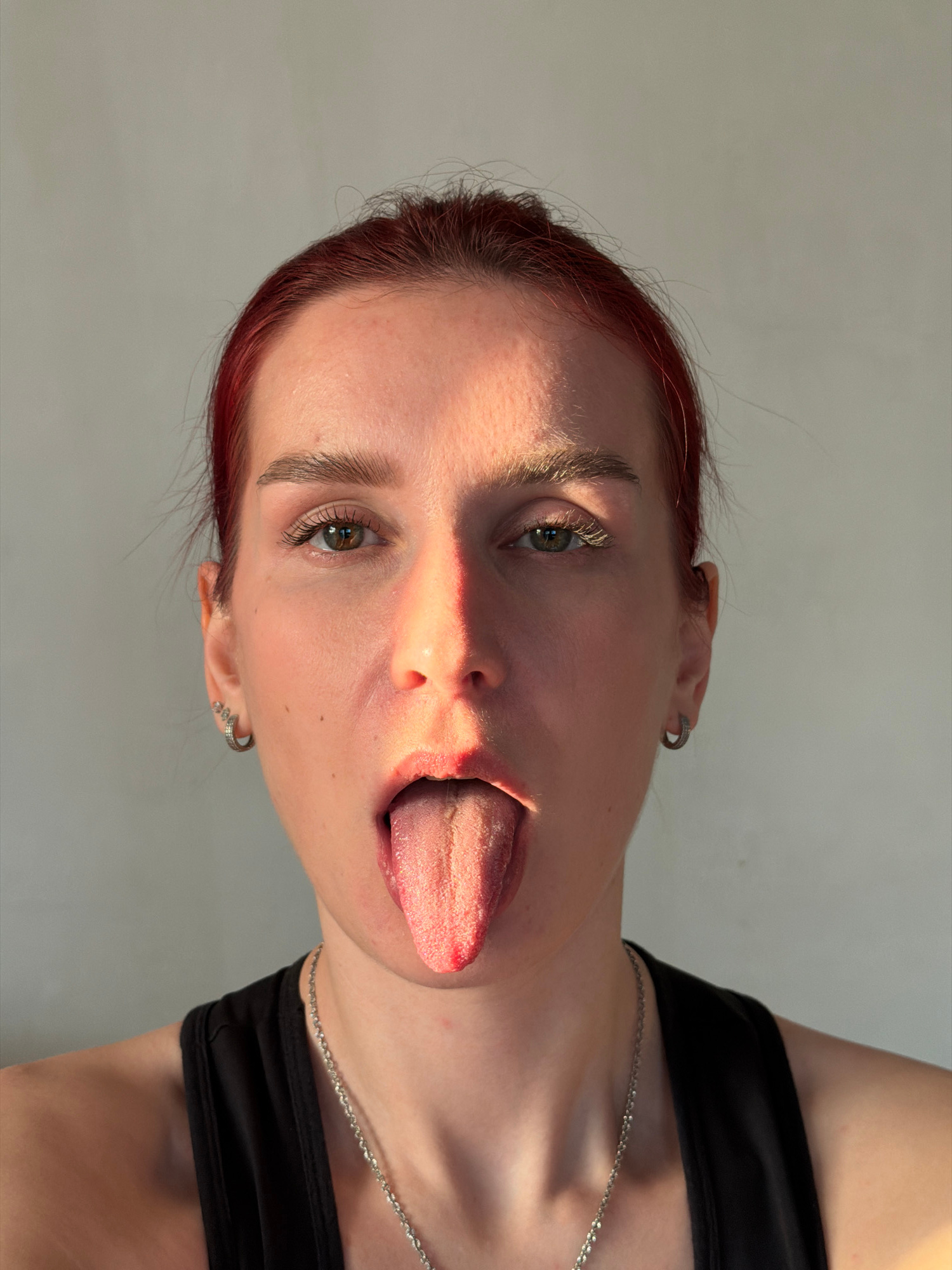 A close-up, informal portrait captures a young person sticking their tongue out. The subject, likely female, has reddish-brown hair and an earring visible in their left ear. Their left eye, with a gre…read more