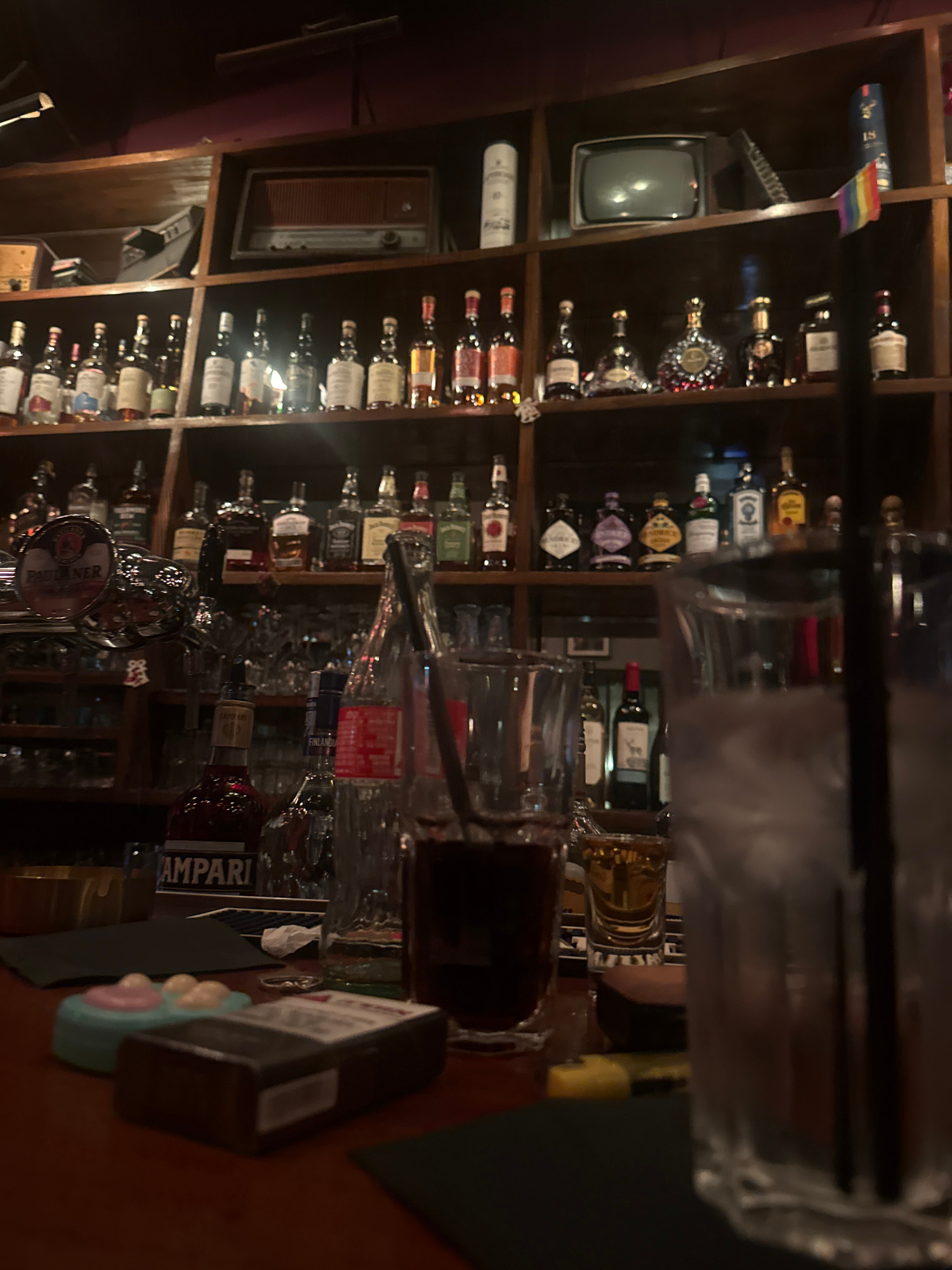 The image captures the interior of a bar with a rustic aesthetic. A large wooden shelving unit, densely populated with liquor bottles, old TV and radio, dominates the background. In the foreground are…read more
