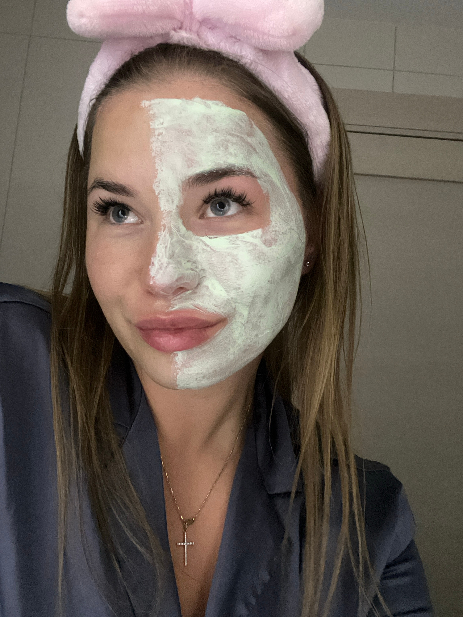 A woman with long brown hair, wearing a pink headband with a bow, has a white face mask applied. She is also wearing a dark blue or grey robe. A delicate gold necklace with a cross pendant is visible…read more