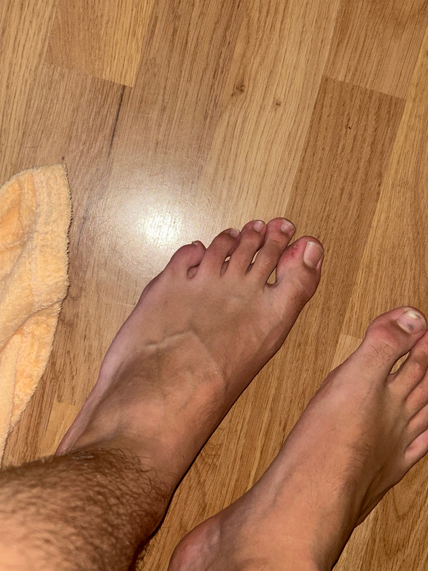 The image shows two human feet on a wooden floor. A part of an orange towel is visible in the lower left corner. The feet are tanned with visible hair. One foot has a dark spot on the big toenail. The…read more